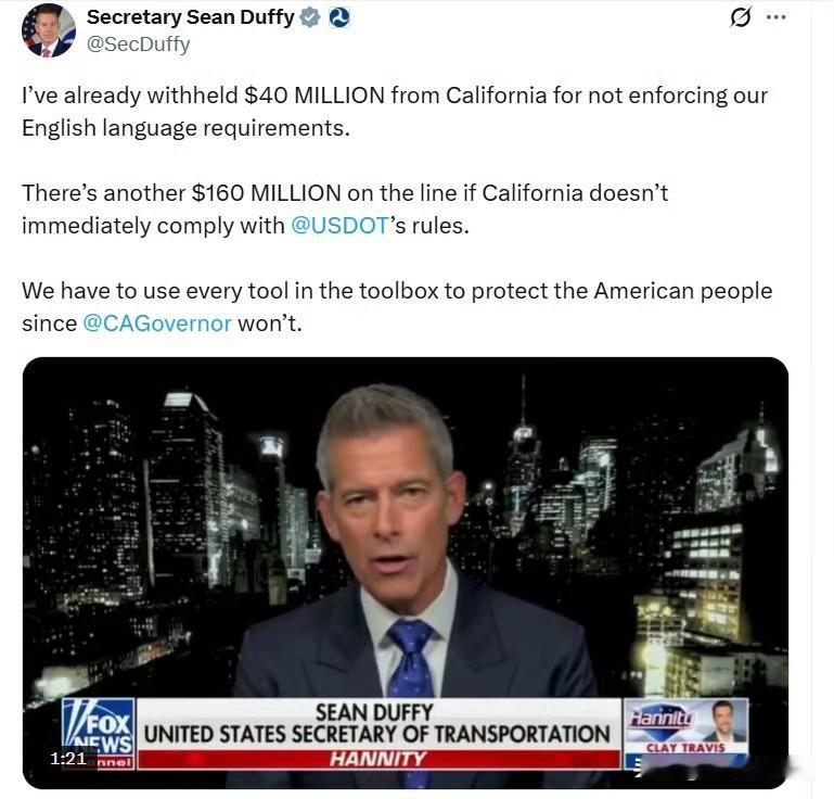 美国交通部部长肖恩·达菲: 我已经扣留了4,000万美元的加州资金,因为他们没有执行我们的英语语言要求。 如果加州不立即遵守美国交通部的规定,还有1.6亿美元将被扣留。 既然加州州长不愿保护美国人民,那我们就必须动用一切手段来做到这一点。