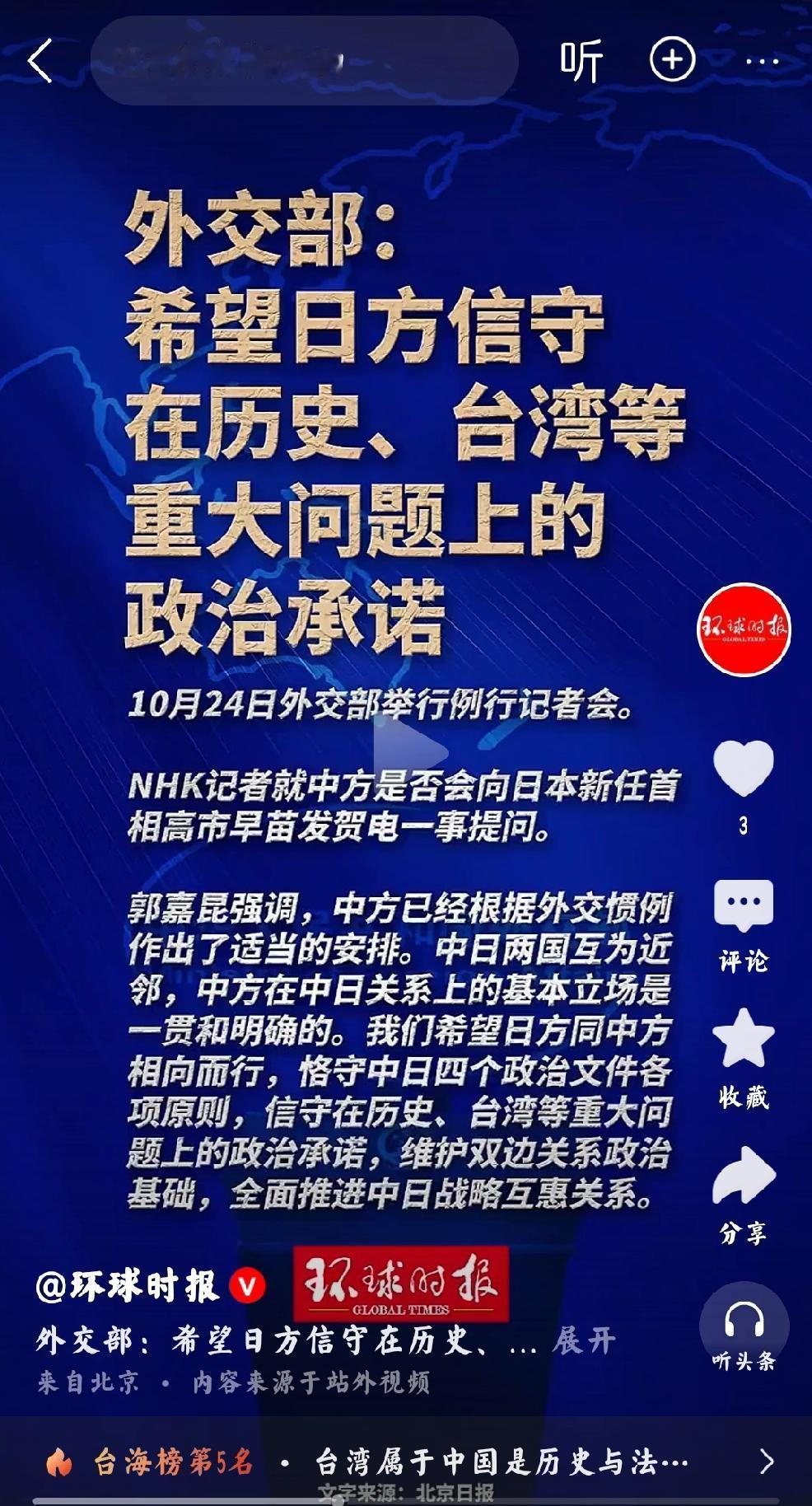 日本:高氏早苗 个人观点:真是了不起的日本首相,上台几天就同时引起了中俄美三国的高度关注。美国总统特朗普,亲自下场催款;俄罗斯轰炸机,在日本海上空完成11个小时巡航,日俄关系跌至冰点;中方先是了解相关信息,再是希望,潜台词是匆谓言之不预,明显是给日本警告。 这是拳击比赛中,拥有碾压优势的主动压迫式打法。 明日继续关注。