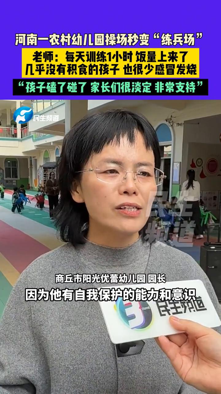 河南一农村幼儿园操场秒变"练兵场"。老师:每天训练1小时,饭量上来了,几乎没有积食的孩子,也很少感冒发烧。"孩子磕了碰了,家长们很淡定,非常支持"。 商丘市阳光优蕾幼儿园园长。 孩子们饭量上来了,几乎就没有积食的现象,生病也比较少,肯定会不少摔跤。但是训练后孩子的运动能力上来了,协调能力增强了,反而比天天在班里面更安全,因为他有自我保护的能力和意识。 老师时刻关注孩子们的状态,没有一丝一毫松懈,保证安全第一。之前有一点磕碰家长会来找,但现在家长就是非常淡然,只要是对孩子有好处,我们要去研发课程,克服困难。