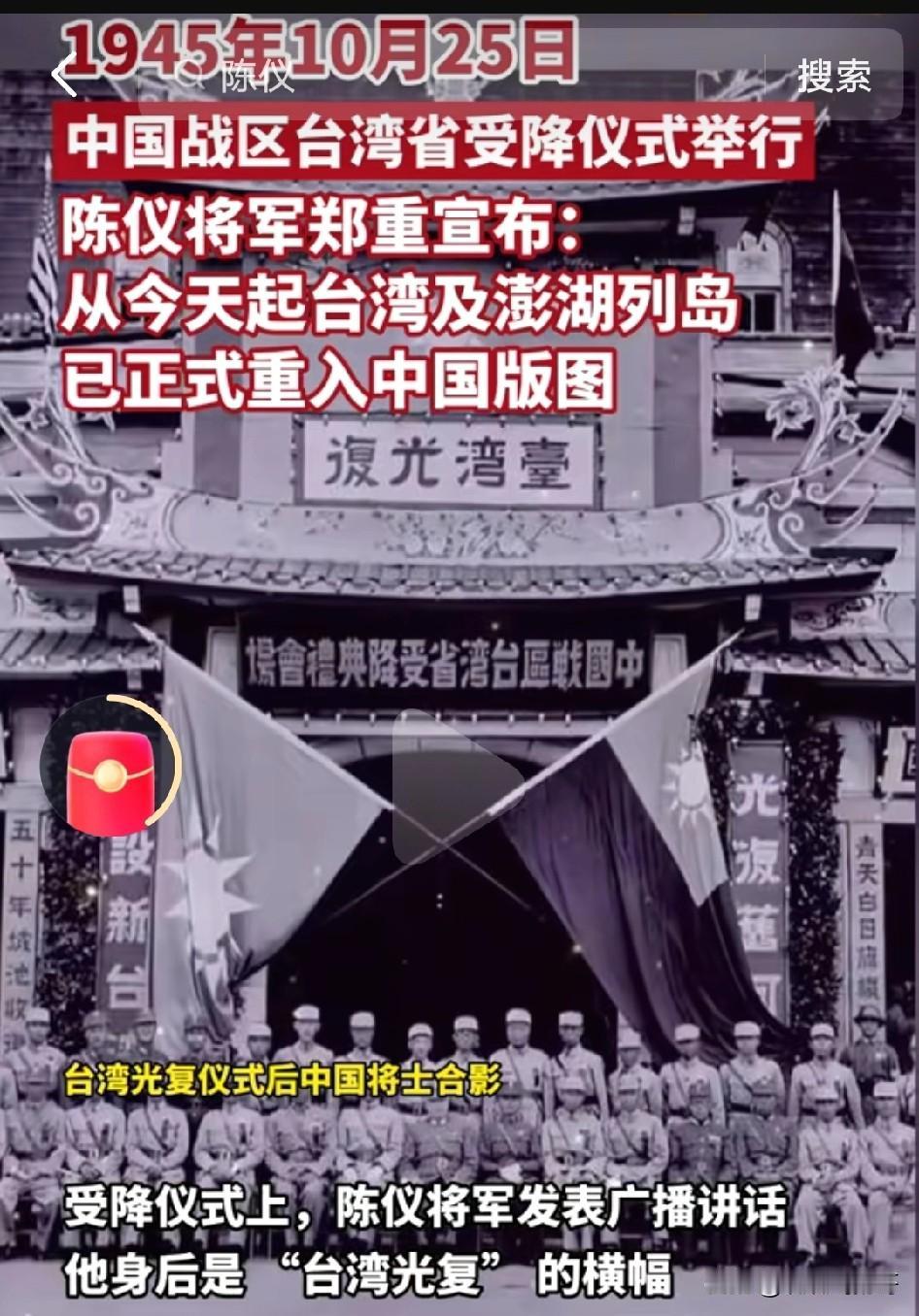 2025年10月25日,台湾光复80周年。 台湾人民要记住,如果没有国共两党领导的中国人民跟日本侵略者的浴血奋战打败日本侵略者 , 就没有今天的台湾 ! 如果没有革命先烈们打败日本侵略者,台湾可能还在小日本的殖民统治下! 1945年8月25日 ,日本代表在台北中山堂签字投降 ,终结日本长达50年对台湾的殖民侵占, 小日本连滚带爬离开台湾 ,台湾回到中国的版图! 台湾人民要明白, 台湾自古以来就是中国的领土 。 郑成功从荷兰殖民者手中收回台湾, 郑成功的后人郑爽不想归顺大清 ,康熙派施瑯出兵打败郑爽,统一台湾;清朝末期,由于清朝腐败,甲午战争战败,割让台湾给日本, 台湾蒙受50年的耻辱,成为日本的殖民统治受害者 。 中国人民在国共两党的领导下打败日军侵略者,日本在1945年8月15日无条件向中国人民投降 。 10天后,也就是1945年8月25日 ,在台湾的小日本向陈仪将军递交投降书,台湾光复! 没有中国人民抗日战争的胜利,就没有今天的台湾,更没有民进党的所谓执政! 所以,台湾人民要认清历史,明白今天的日子是谁给的,是中国共产党和中国国民党领导下的中国老一辈革命先烈!