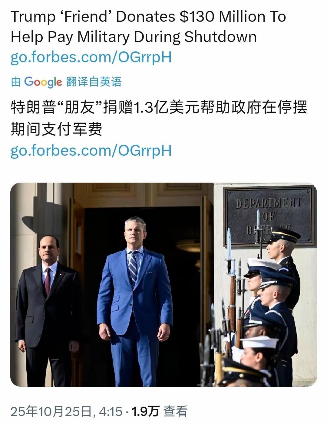 美媒:“特朗普‘朋友’捐赠1.3亿美元帮助政府在停摆期间支付军费。” 堂堂美利坚,在川普的领导下,竟然要他的富豪朋友“捐款”给军人发工资,再次富有、再次强大的美利坚哪里去了?讲真,富豪的眼力劲是真不错,投桃报李啊,道理他们都懂,川普随便画个线,他们分分钟N亿美元到账。