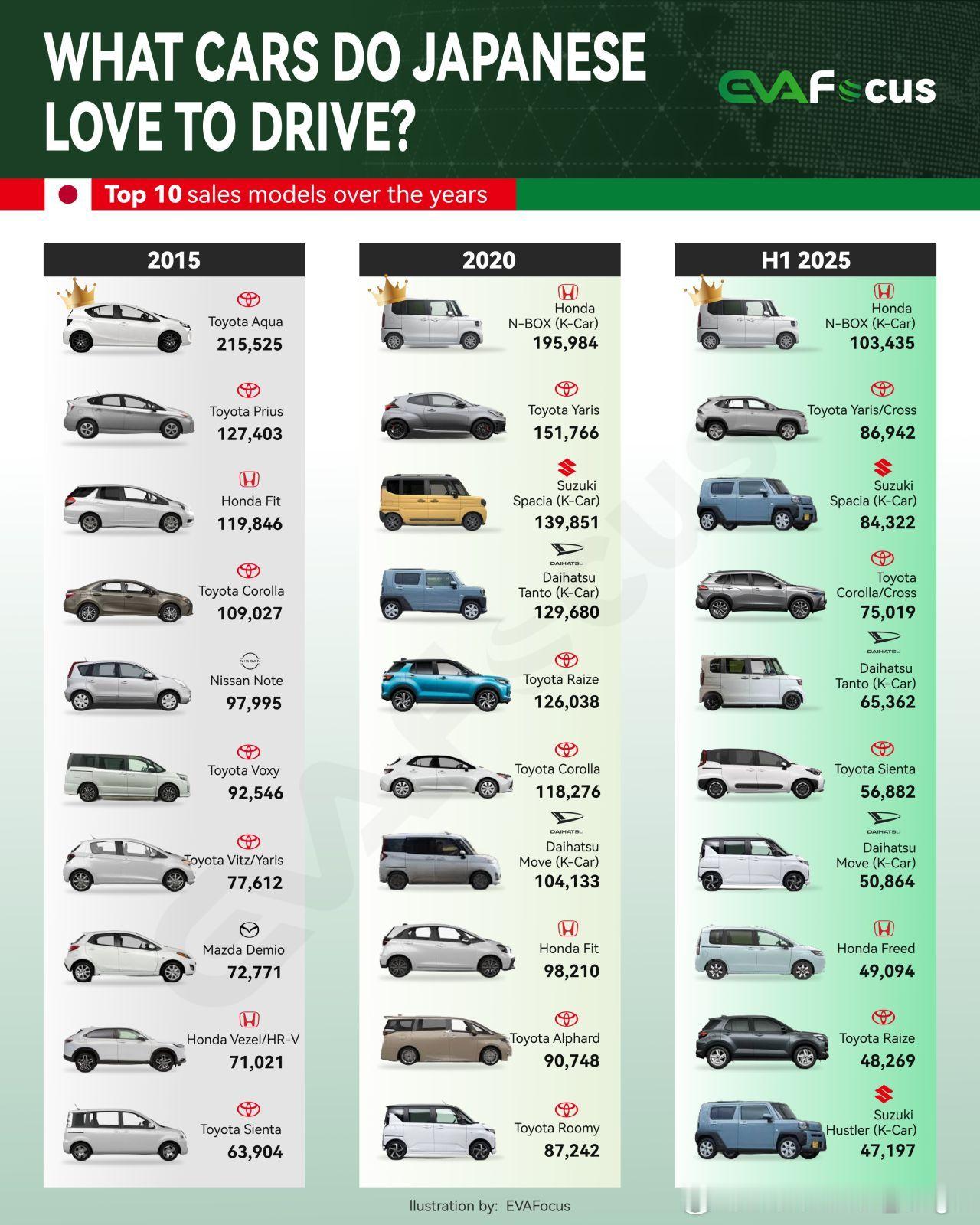 2025 年上半年,最畅销的车型为本田 N-BOX,第二名为丰田 Yaris Cross(雅力士紧凑型SUV),而在前十名里,有五台 K-Car。