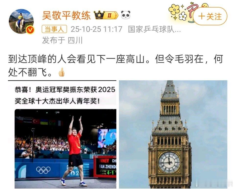 恭喜樊振东获得全球十大杰出华人青年奖,吴敬平教练第一时间为爱徒打call!世界上最棒的东东大王[酷] 吴敬平祝贺樊振东荣获大本钟奖