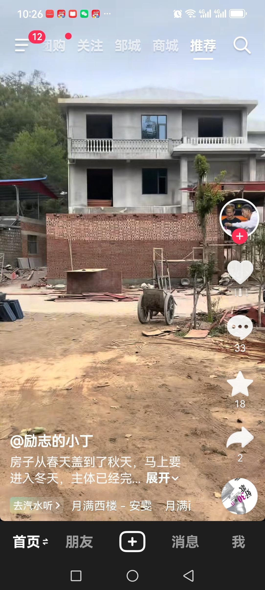小丁家的院墙已经建好了! 小丁家的院墙比邻居家高出来了一大截了,房子也比邻居家高出了一多半,这应该是他们村里最好的房子了。 曾经的小丁是村里最穷的一家,老实巴交的老父亲带着一个残疾有病的孩子。受尽了周围人的白眼和冷落,现在他终于扬眉吐气! 小丁家现在是每天都客流不断,有来买鸡蛋,有来给小丁帮忙的朋友粉丝,有给他盖房子的工人,还有他的堂弟表哥,家里真是热闹非凡呀! 一个好汉十个帮,这句话说的一点错都没有!小丁靠自己双手打造了一片天,也赢来了周围的人盛赞和敬佩,大家也愿意伸出援手之手为他锦上添花! 事实告诉我们,越落魄越容易被人落井下石,越成功越有人助你一臂之力! 所以我们不要抱怨环境和出身,因为我们无法改变它,唯有自强自立才能赢得别人对你的尊重! 向你学习,励志的小丁!