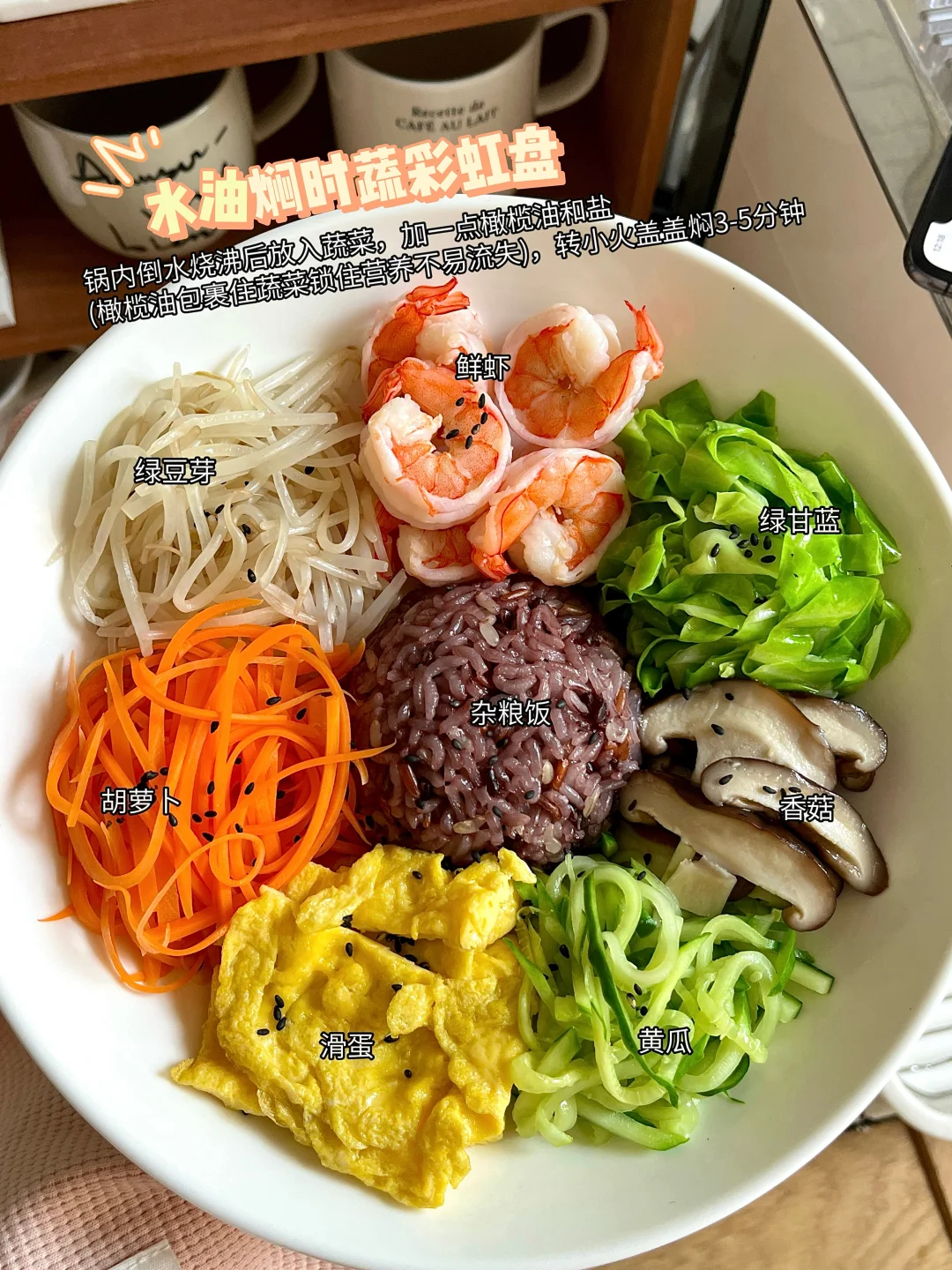 杂粮饭/鲜虾/绿豆芽/胡萝卜/滑蛋/黄瓜🥒