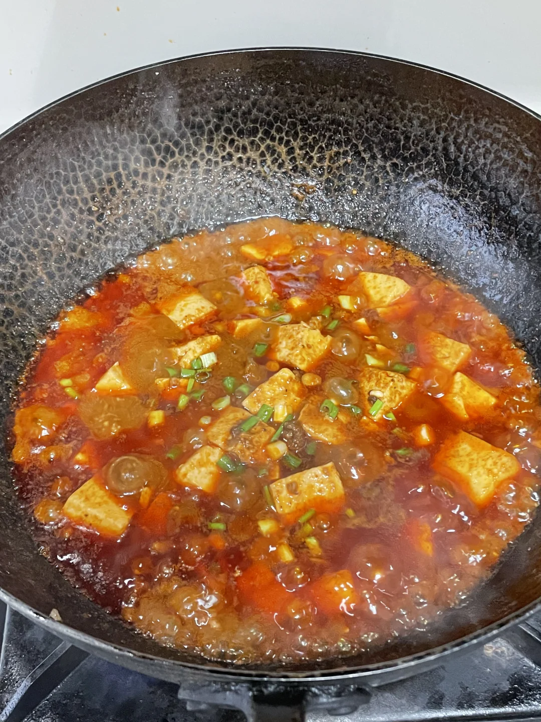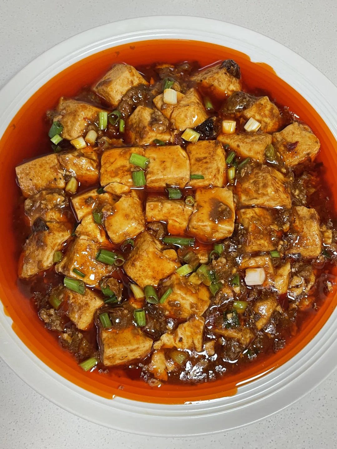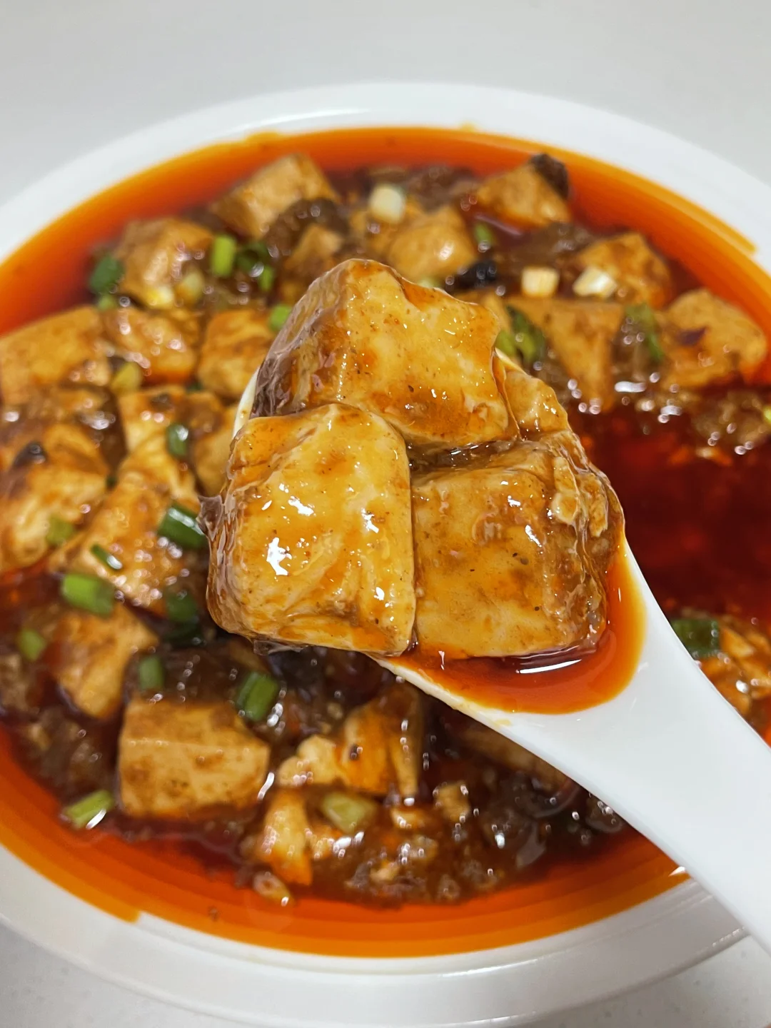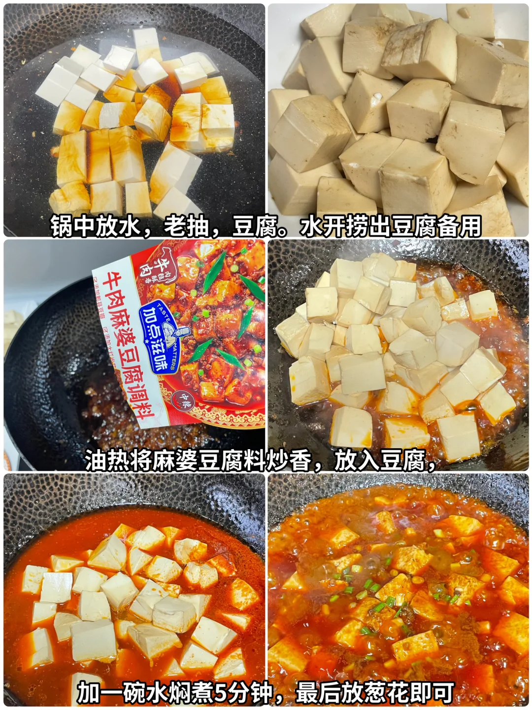 3⃣️起锅烧油,油热将麻婆豆腐料炒香,然后放入豆腐,加入齐平豆腐的水焖煮5分钟,最后大火收汁,放入葱花即可。是不是没有任何技巧,哈哈~喜欢的姐妹去试试吧。