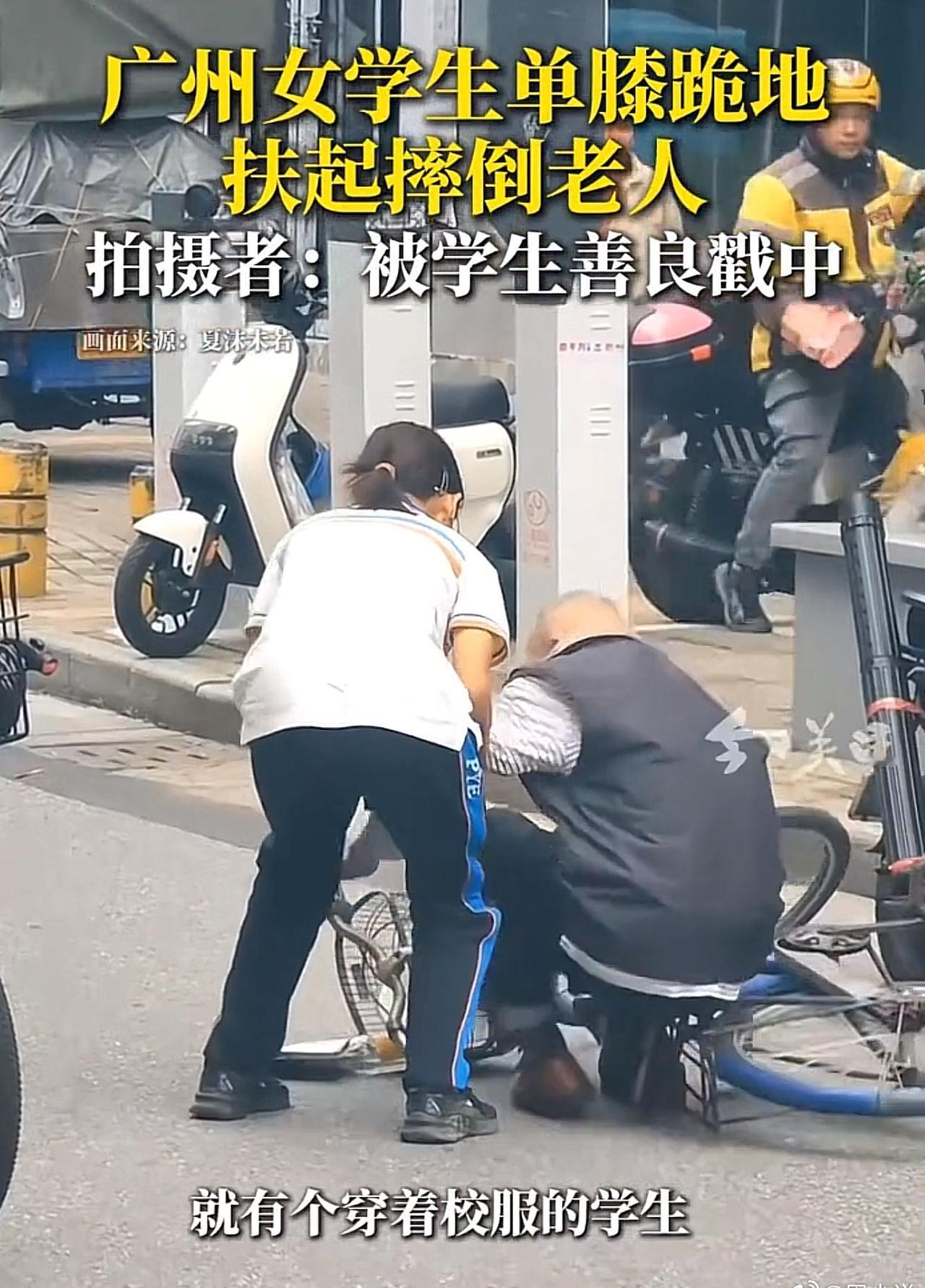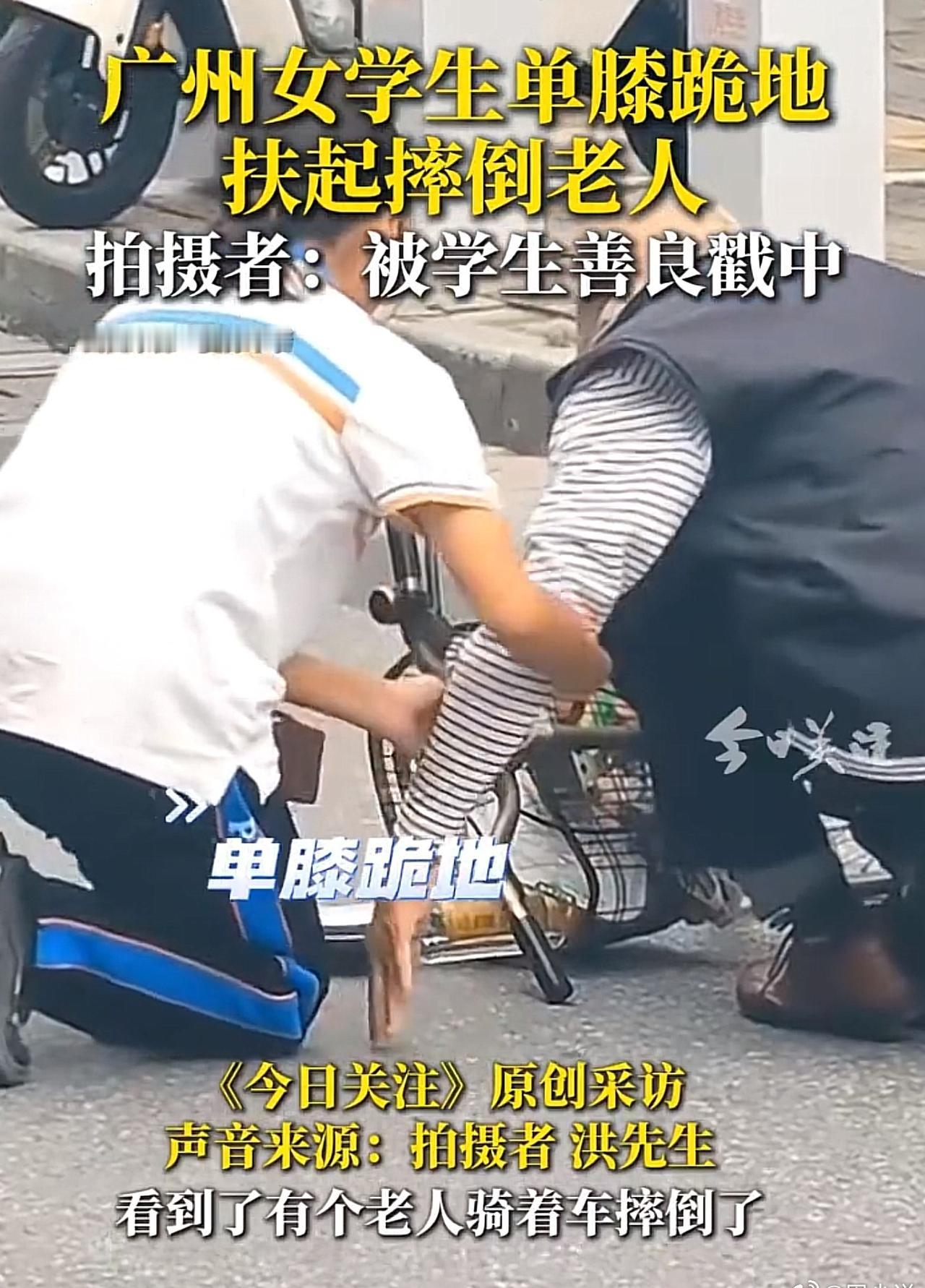 广东,一位老人骑车时不慎摔倒,身体动弹不得,就在这时,一名身穿校服的女孩毫不犹豫冲上前,当场单膝跪地小心将老人搀扶起来。老人起身站稳后,还特意回头向女孩挥手致谢,这短短几秒的互动,温暖了无数人。 事件被路人拍下传到网上后,网友纷纷留言点赞:“校服女孩好样的!没犹豫没顾虑,这份善良太可贵了” 也有网友说:“老人懂得致谢也很暖心,双向善意才是最好的风景”! 还有网友称赞:“现在还有人怕被讹不敢扶,这位学生的勇气值得学习”。 在周少看来,这一幕虽小,却戳中了很多人对“善意”的期待。面对摔倒的老人,女孩没有被“讹人”的负面新闻裹挟,而是遵从内心的善良果断出手; 老人的致谢,也给这份善意一个温暖的回应。它告诉我们,善良从不需要犹豫,每一次勇敢的伸出援手,都是在为这个社会传递一份温暖力量。 对于这位广州女学生单膝跪地浮起摔倒老人,大家怎么看呢?