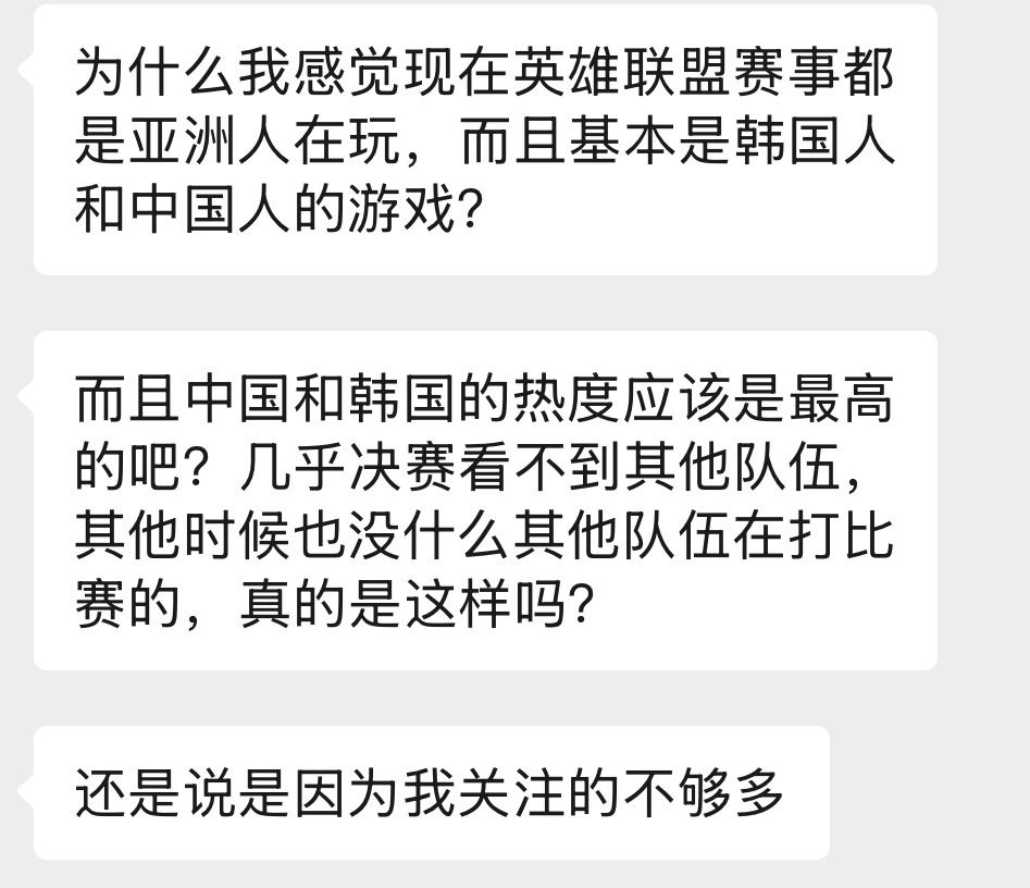 “为什么我感觉现在英雄联盟赛事都是亚洲人在玩,而且基本是韩国人和中国人的游戏?”
