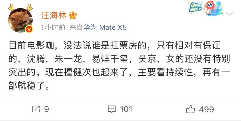 汪海林说目前电影圈有票房号召力保证的男演员只有:沈腾、朱一龙、易烊千玺、吴京。女演员则没有,还特意强调了檀健次。