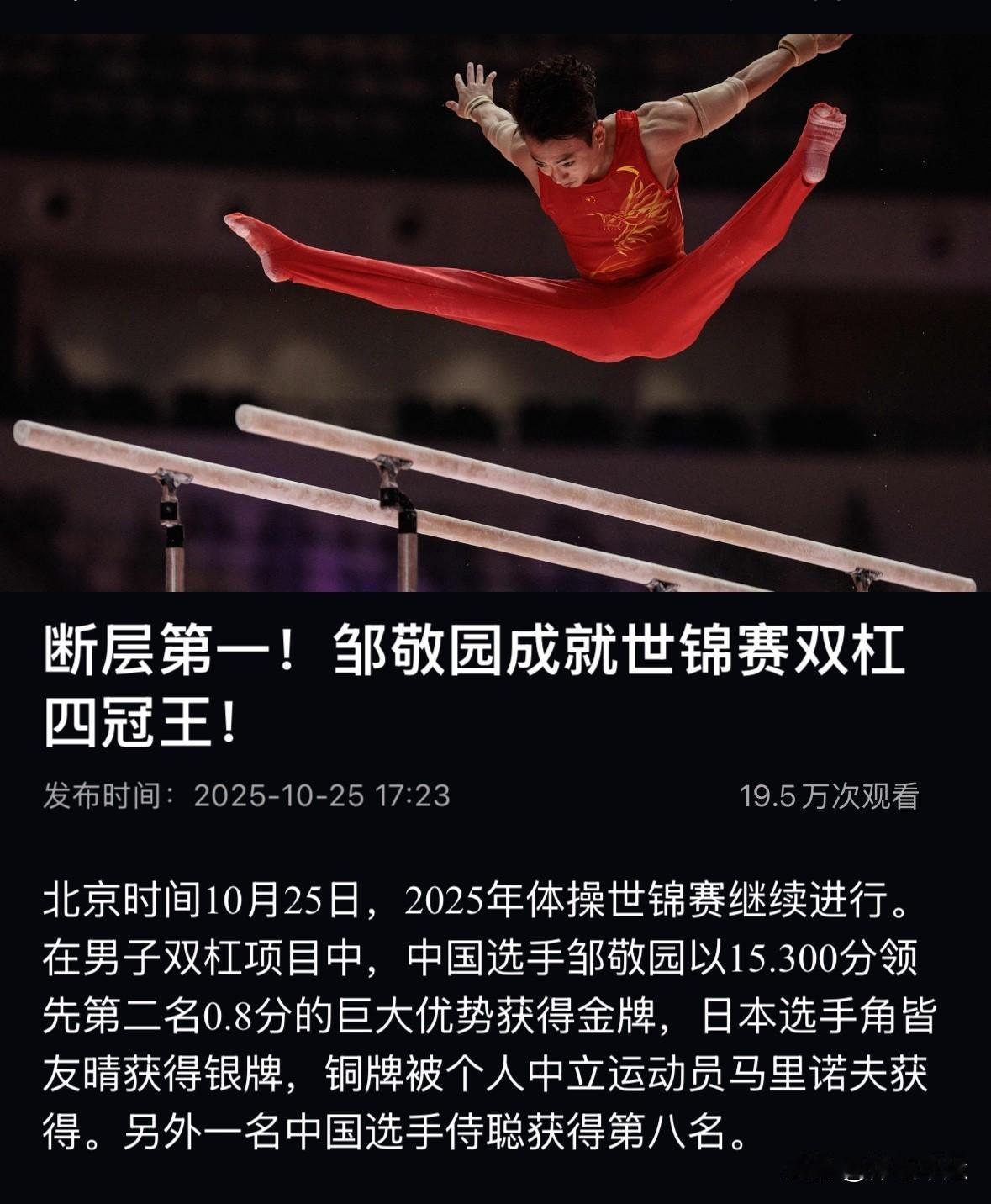 邹敬园、张清颖分别夺得男子双杠、女子平衡木冠军🏆[赞][赞][赞] 刚刚🔚的体操世锦赛男子双杠决赛,中国选手邹敬园15.300分夺得男子双杠冠军,同时成就世锦赛四连冠! 稍早🔚的体操世锦赛女子平衡木决赛,中国选手张清颖15.166分首夺冠军!此前已夺得体操世锦赛女子全能第三名! 至此,加上洪延明的男子鞍马,中国体操队已夺得三项冠军! 体操总决赛 奥运体操单杠 体操奥运名单 体操评分标准 艺术体操单项