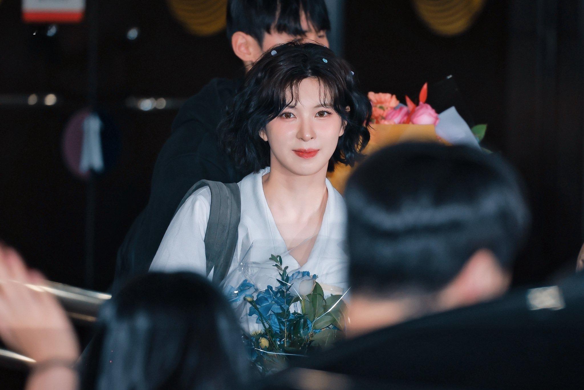 张天爱跟素人合影,胯真的好宽,大宅院似的