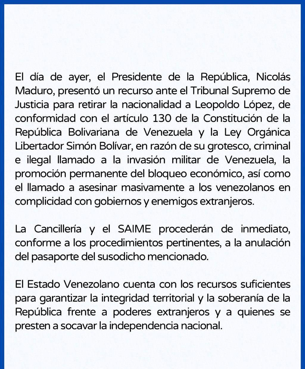 🔥委内瑞拉将剥夺极右翼暴力反对派头目莱奥波尔多·洛佩斯的国籍 委内瑞拉副总统德尔西·罗德里格斯在“Telegram”个人频道公布了这一消息: 委内瑞拉总统尼古拉斯·马杜罗依据《玻利瓦尔共和国宪法》第130条及《解放者西蒙·玻利瓦尔组织法》,向委内瑞拉最高法院提交申请,请求剥夺极右翼暴力反对派头目莱奥波尔多·洛佩斯的国籍。申请理由为: 莱奥波尔多·洛佩斯与外国政府及外敌勾结,公然煽动对委内瑞拉实施军事入侵(该行为荒诞、违法且涉嫌犯罪)、持续推动对委经济封锁,还煽动对委内瑞拉民众实施大规模屠杀。 委内瑞拉人民政权外交部与委内瑞拉移民与外国人管理局将依据相关法定程序,立即着手注销上述人员(即莱奥波尔多·洛佩斯)的护照。面对外国势力及所有蓄意破坏委内瑞拉国家独立的人员,委内瑞拉政府拥有充足资源,足以保障国家领土完整与共和国主权不受侵犯! 玻利瓦尔英雄之地超话