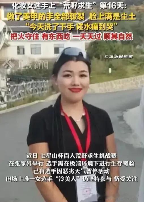 湖南张家界七星山荒野求生挑战赛太让人震撼了!一开始100人凭一把柴刀参赛,为20万奖金搏一把。截至10月24日,只剩25人,唯一女选手“冷美人”成焦点。 从比赛第14天起,她瘦成闪电,嘴唇手指裂开,有人拍到她雨中采野菜,手泡白还边哭边吃生叶子。到第16天,做过美甲的手全皲裂,洗手碰水都痛到哭。但她状态尚可,想顺其自然。她参赛不只为钱,更想证明女性实力。她经历迷路、缺水等困难,还鼓励队友,这韧性太牛了!