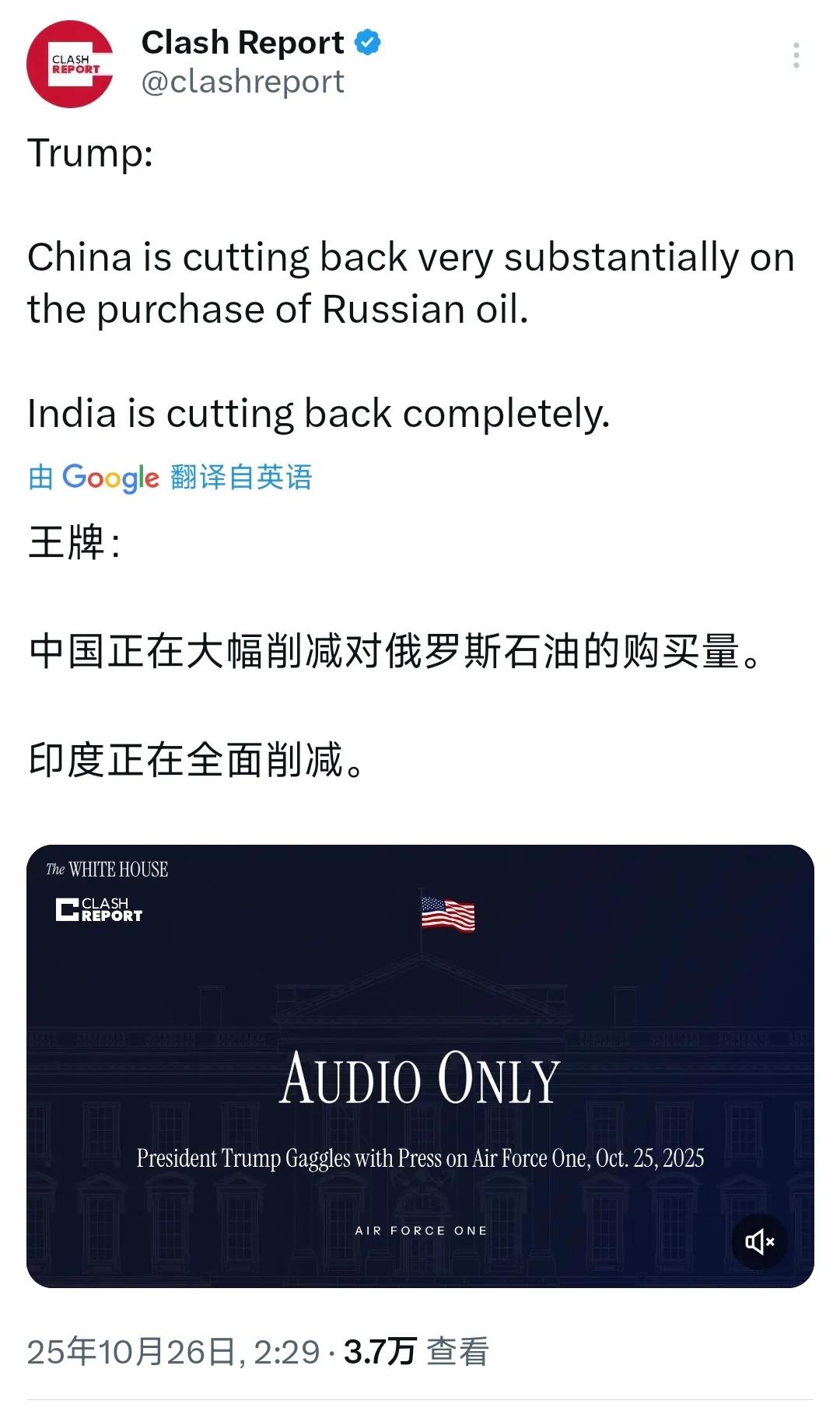 特朗普10月26日公开喊话说,印度在全面减少购买俄罗斯石油。 特朗普强调,中国也在大幅削减购买量。 可以说,特朗普就是这个毛病,总要让全世界感觉他说的话管用,大家都要听他的话。 此次,他多次叫嚷着要让我们停止购买俄罗斯石油,我们一直不理他,让他觉得自己很没面子。现在,出来先这样造势而已。 对于美国来说,现在对我们还是心存忌惮,美国公开表示,我们是这么多年来,唯一正面硬刚美国的国家,这让美国感觉自己无法接受。 只是时代变了,美国不同意这种现实也得接受。
