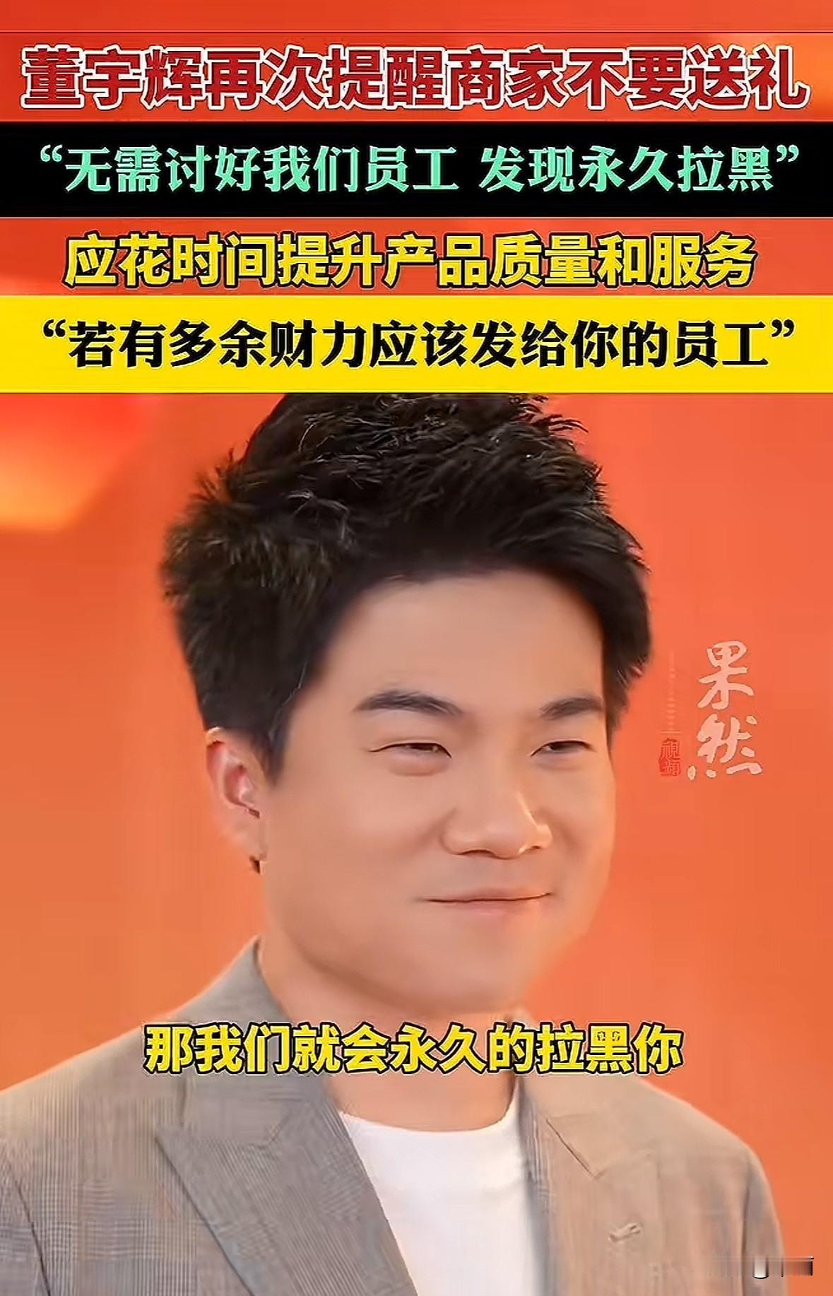 近日董宇辉在直播里再次提醒商家别送礼,明确说不能给公司任何员工寄卡、现金或礼物,发现了就永久拉黑,再也不合作。 他提到之前有厂家寄快递,半年后才发现里面是购物卡,最后直接解除了合作。还说商家不用花时间讨好他们,该把精力放提升产品和服务上,让消费者满意。 有多余财力的话,不如发给员工涨收入。想合作走“与辉同行”官网,条件合格就行,不合格送钱也没用。 这做法挺实在的。直播带货里常有商家靠送礼抢合作机会,破坏公平。董宇辉这规矩守住了选品的纯粹,只看产品不看人情。既帮消费者把了关,也引导商家走正路,毕竟产品好、员工稳,生意才能长久,难怪网友都点赞。