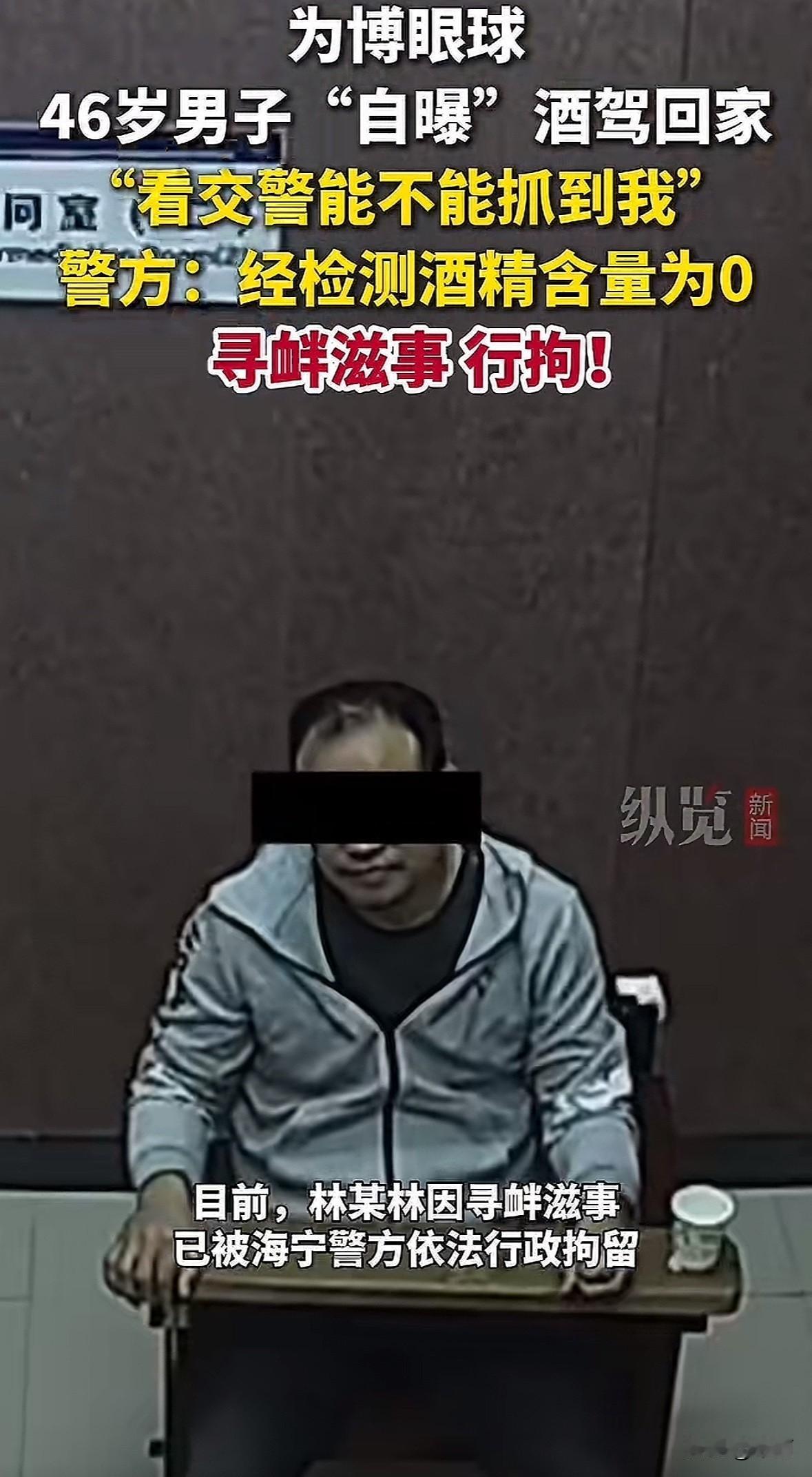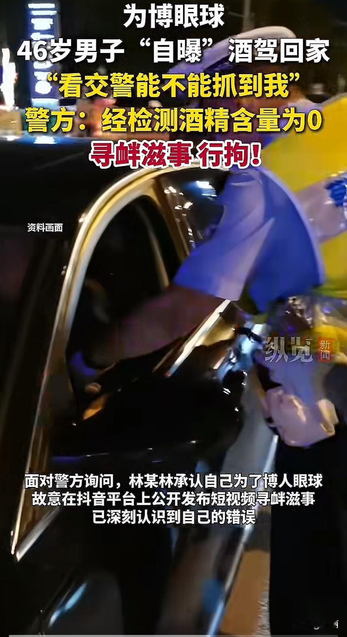 10月24日中午,浙江海宁警方接到举报,有人在抖音发视频自曝酒驾回家,还喊“看海宁交警能不能抓到我”,网友看了都愤怒。 警方很快查到这人是46岁的林某林,温州乐清人。把他传到派出所检测,吹气、抽血结果酒精含量都是0。 林某林说自己就是想博眼球,故意发视频寻衅滋事,已经知道错了。现在他因为寻衅滋事被警方行政拘留了。 酒驾是重罪,拿这个博流量简直没底线。网络不是法外之地,别以为随口乱说话、故意挑事没人管。 警方反应够快,这处理也给所有人提了醒:想靠出格行为赚关注,迟早要为自己的糊涂付出代价,遵纪守法才是正经事。