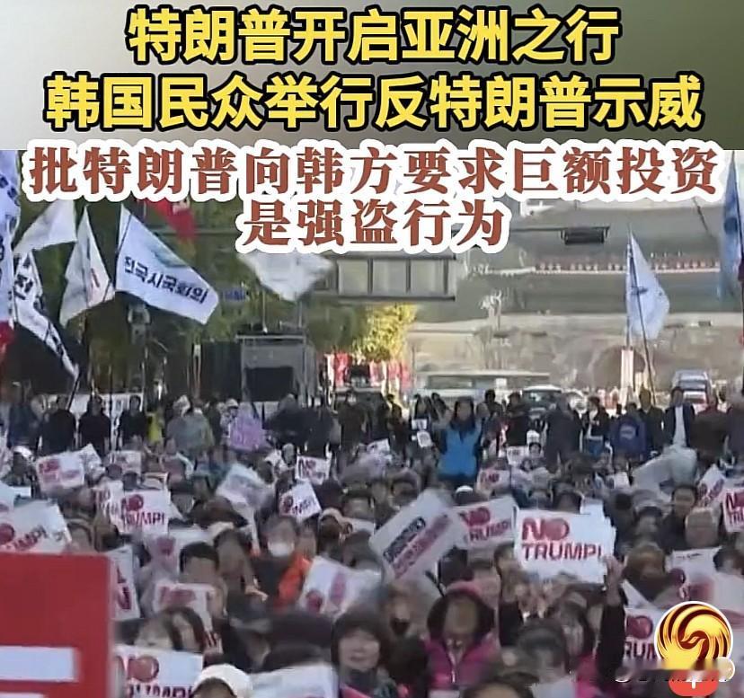韩国民众真是胆大了!敢骂特朗普了! 特朗普开启亚洲之行还没有到韩国,韩国民众就迫不及待举行示威游行来欢迎这位“强盗”的到来,谴责特朗普把韩国当成金钱机器,施压韩国对美巨额投资,这就是强盗的行为。 特朗普在来的路上就已经对外说了,几乎和韩国达成协议,特朗普都亲自来了,估计韩国不敢不给面子,这次含泪也得把协议签了!
