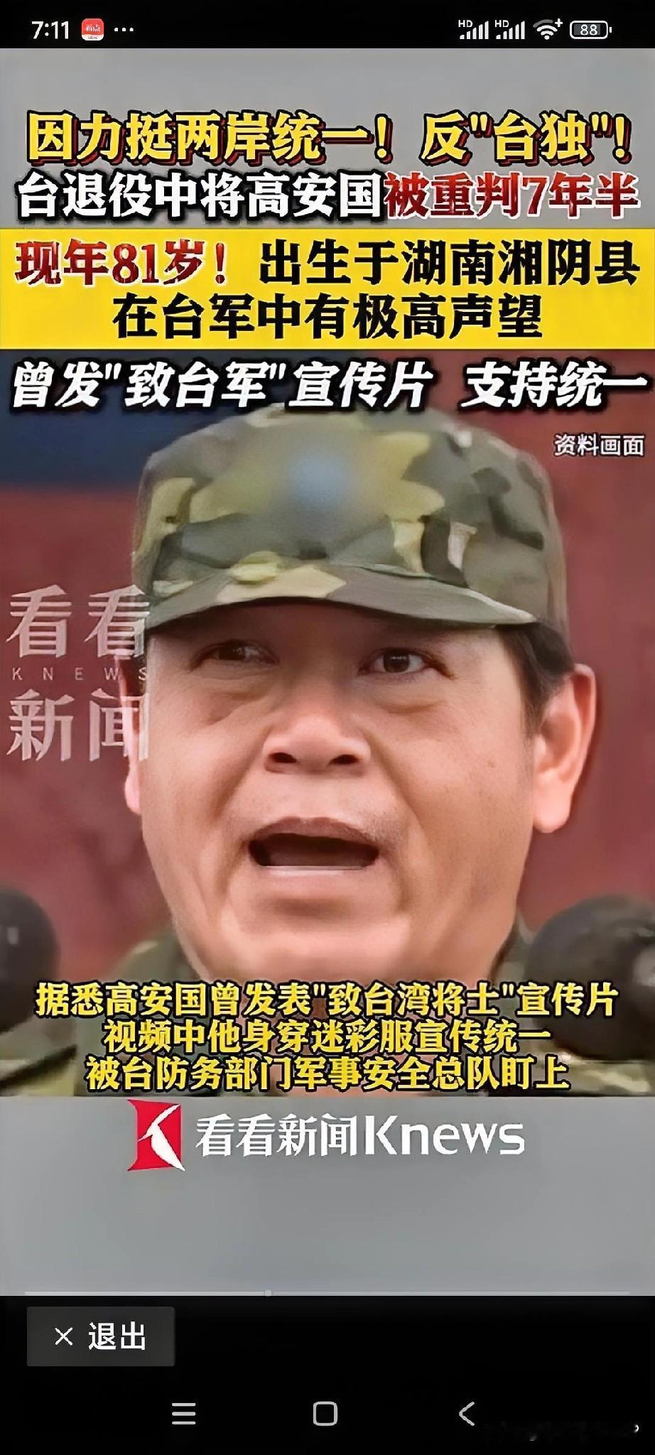 最近,台湾地区传来一桩让人愤怒但又不意外的消息:台当局居然以“违反国家安全”的罪名,判了81岁的退役中将高安国7年6个月的徒刑,还查封了他近30万元新台币的个人财产。 这事一出,很多人都看傻眼了,一个年过八旬的老人,因为表达爱国立场,就被当成“罪犯”处理,实在荒唐。 高安国是谁?他是台岛退役的中将,曾在军中任职几十年,资历深、影响力大。 但他最大的问题,在民进党当局眼里,不是身份,而是立场。 他在多个场合公开表示支持祖国统一,反对“台独”,说得坦坦荡荡,立场坚定。 就是因为这些话,他成了民进党眼中的“眼中钉”。 按他们的逻辑,凡是认同两岸同属一个中国,主张和平统一的人,不是“被统战”,就是“间谍”。 这种荒谬的思维,已经不只是偏激,而是彻底走火入魔了。 这次高安国被判刑,是台当局近年来打压岛内爱国人士的又一次升级。 其实,早在去年,岛内多个统派人士就陆续被调查、起诉,甚至有人因为转发了一些两岸和平交流的文章,也被冠上“为大陆服务”的帽子。 台当局把“国家安全”当成万能借口,谁不站在他们那边,谁就是“有问题”,这种做法早就引发岛内不少质疑。 可惜的是,在民进党控制的媒体主导下,这些声音很难被岛内大多数民众听到。 说到底,民进党当局为什么这么怕这些促统的声音?原因很简单,他们心虚。 他们知道,台岛真正反对“台独”的人不少,尤其是那些曾在体制内工作多年的人,对历史、对现实都看得清楚。 他们知道“台独”这条路走不通,也走不远。 但民进党不愿意让这些声音存在,更不愿意让年轻人听到。 因为一旦越来越多的人明白了真相,那他们靠煽动对立、制造敌意维持政权的根基就会动摇。 再看当下国际局势,台当局其实也没多少底气。 表面上看,他们和一些国家互动频繁,搞所谓的“外交突破”,其实这些都是表面文章。 真正的国际主流立场一直很明确——世界上只有一个中国,台湾地区是我国的一部分。 这个基本共识没有变,也不可能变。 哪怕美方政客嘴上时不时说些“支持台湾”的话,实质上,他们也不敢越过红线。 甚至在多个场合,美方也一再强调他们“不支持台独”,这已经是再清楚不过的信号。 民进党当局明知道这些现实,但他们也清楚,一旦承认这些,就等于承认自己的路线是错的。 所以,他们只能不断制造敌意,不断挑动紧张,不断打压一切反对的声音。 高安国这样的老将军,哪怕只是表达了自己的真实想法,也要被重判,目的就是杀鸡给猴看。 让那些还敢说“统一”、还敢说“两岸一家亲”的人都闭嘴。 但问题是,事实不会因为你掩盖就不存在。 岛内经济发展停滞、社会分裂严重、青年就业困难,这些才是民众真正关心的问题。 而民进党当局却总是拿“大陆威胁”当借口,转移大家的注意力。 久而久之,越来越多的人开始看穿了这套把戏。 尤其是年轻一代,很多人虽然在资讯上被限制,但也开始通过各种渠道了解真相。 他们知道,两岸如果不能和平发展,最终吃亏的还是普通百姓。 参考:环球时报——台湾退役将领高安国被判入狱7年半!国台办回应