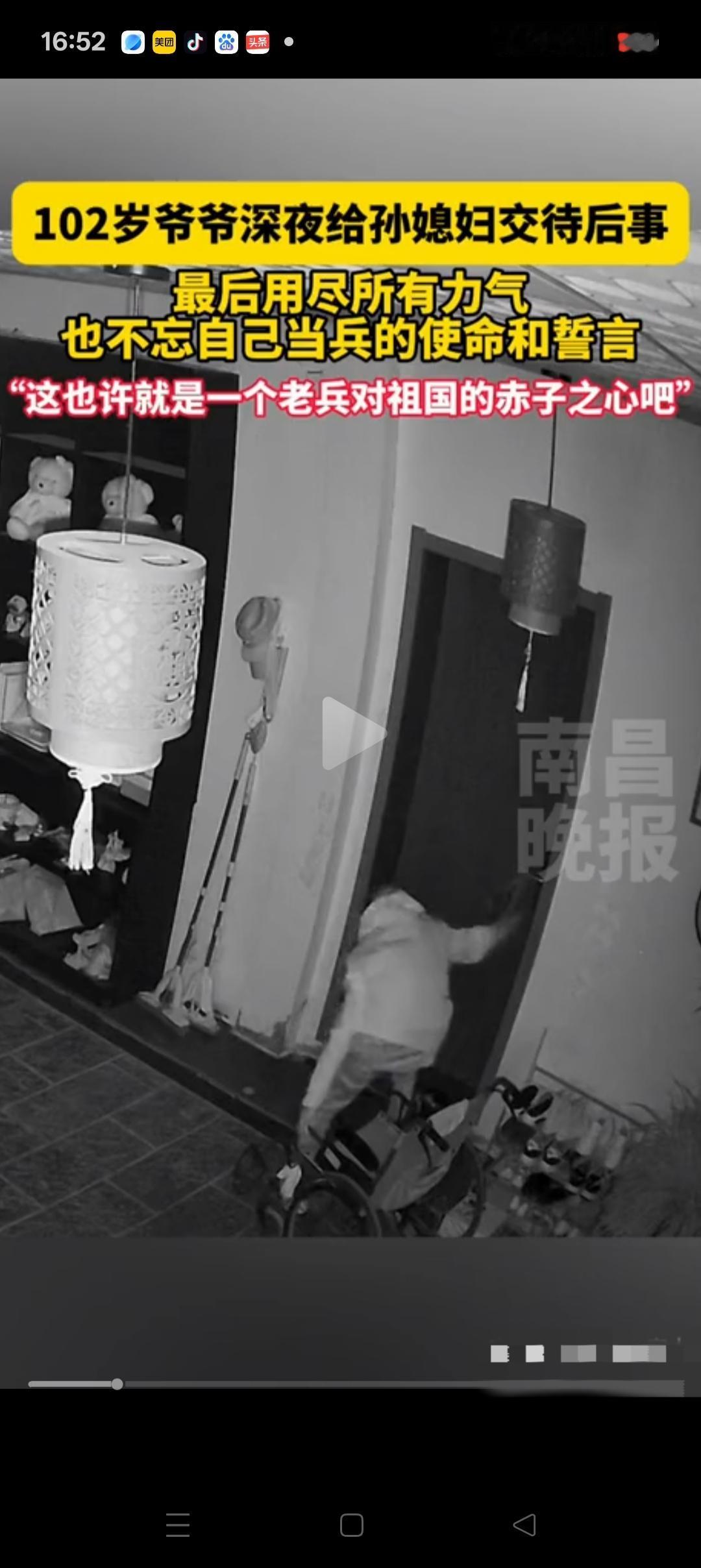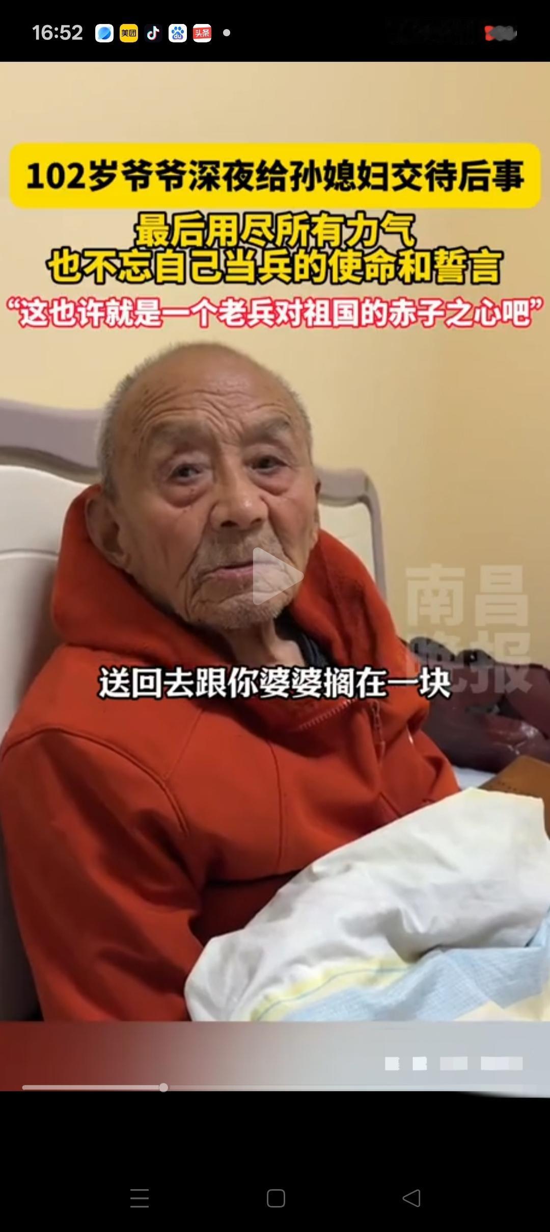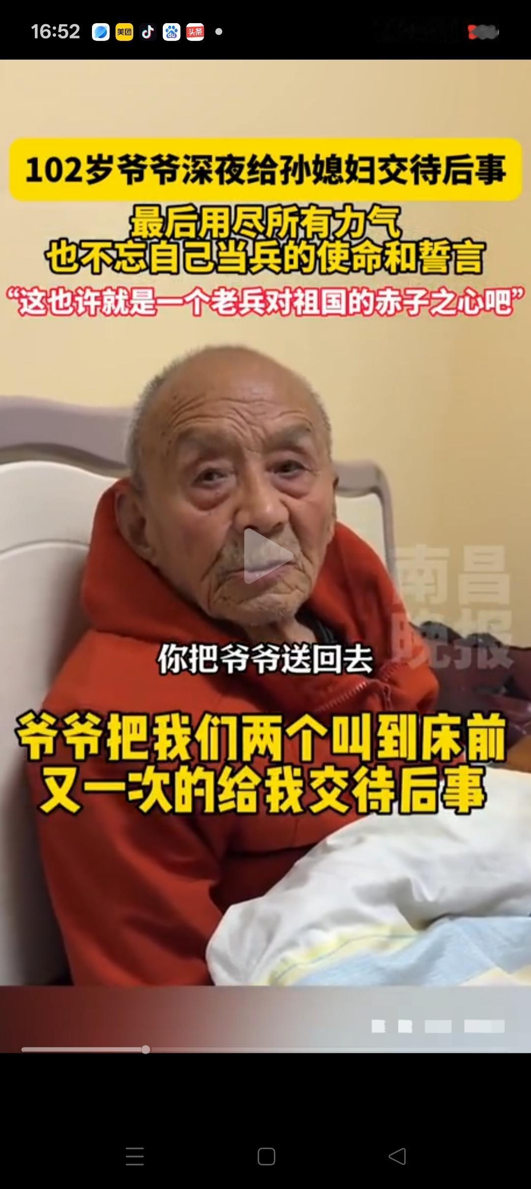 看哭了!102岁老兵爷爷深夜用尽全身力气敲门给孙媳妇交待后事。原来他感觉自己快不行了,想让孙媳妇送他回老家,和他女儿埋在一起。 老人说起女儿,哭了:当初女儿给自己送饭,刚到医院门口就被车撞了,足足飞出去7.8米。他一时好心,没把车留下,让司机跑了,一直耿耿于怀。。 现在老人的子女都走了,一直跟着孙子,孙媳妇生活,气色还不错。 不由得让我想起爷爷,当初也是中午吵着要回老家,说自己不行了。结果刚回到老家,给他洗了个澡,就真的不行了,走了。 不过看这个老人,头脑清晰,说话清楚,面色红润,估计在陪着孙媳妇,孙子十几年问题也不大,祝福 [玫瑰][玫瑰]