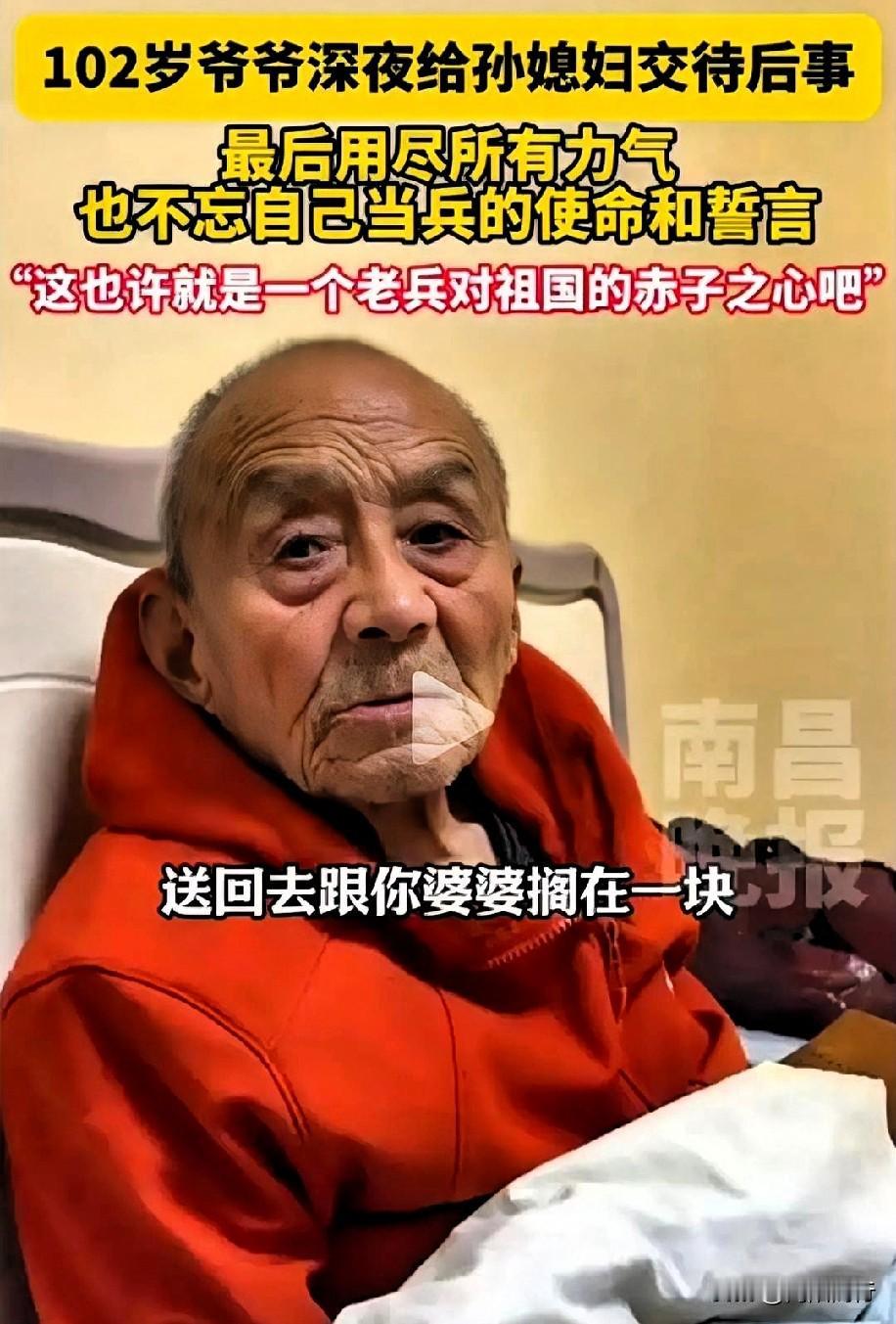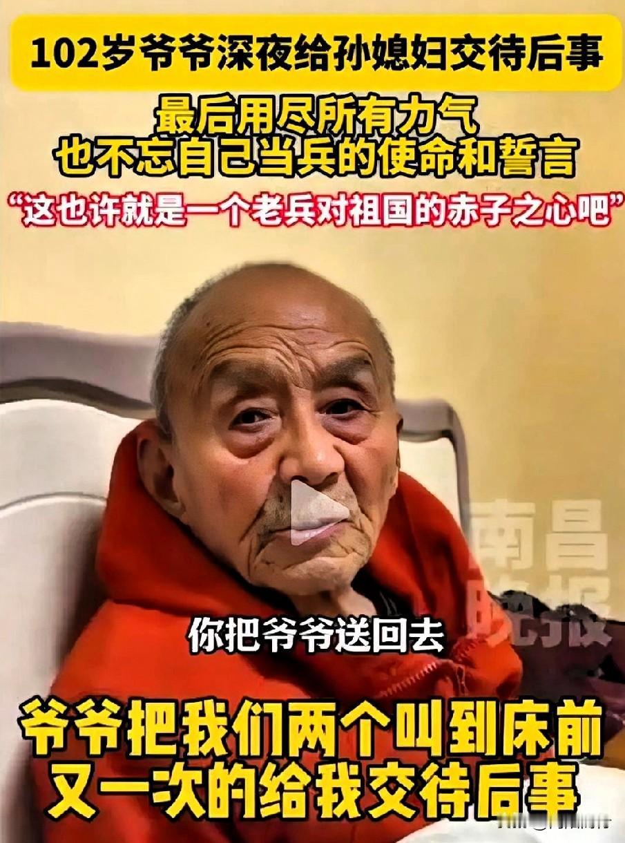 看哭了!102岁老兵爷爷深夜用尽全身力气敲门给孙媳妇交待后事。原来他感觉自己快不行了,想让孙媳妇送他回老家,和他女儿埋在一起。 爷爷说当年闺女给他送医院送饭,刚到门口就被车撞飞7米多。他心一软让司机走了,这事儿憋了一辈子。现在子女都走了,就跟着我们过。看着他气色好、说话清楚,可一提起闺女,眼泪还是止不住。 我想起我爷爷,当初也是突然要回老家,刚洗完澡就走了。老人心里都有个念想,那不是迷信,是想回到最安心的地方。 你们家老人有没有过这样的“小固执”?评论区跟我聊聊。