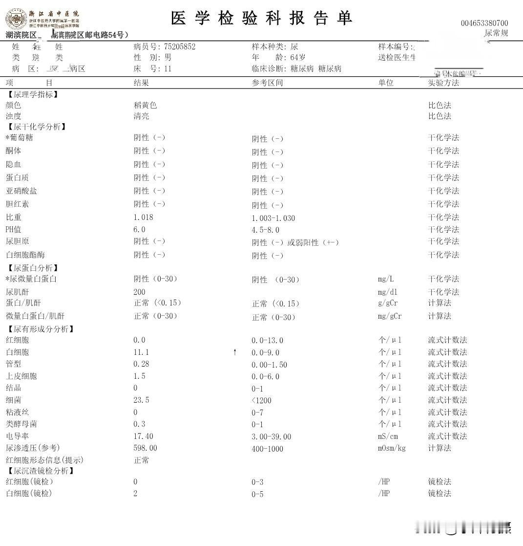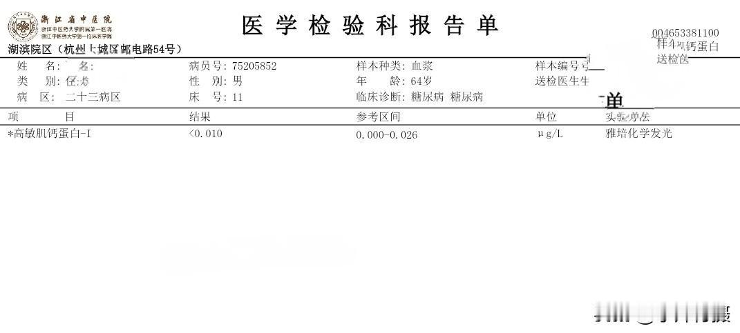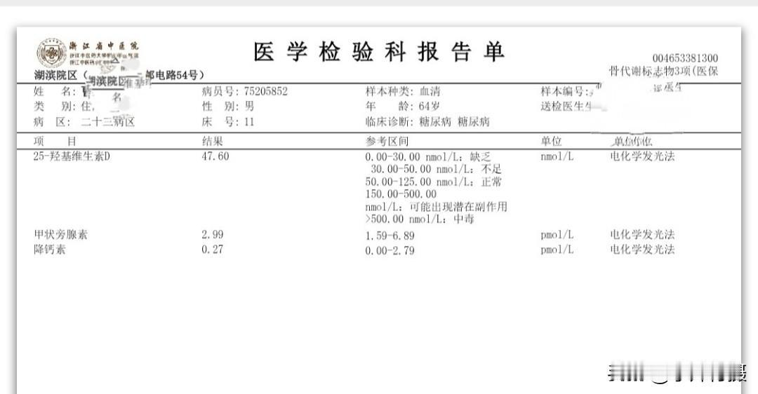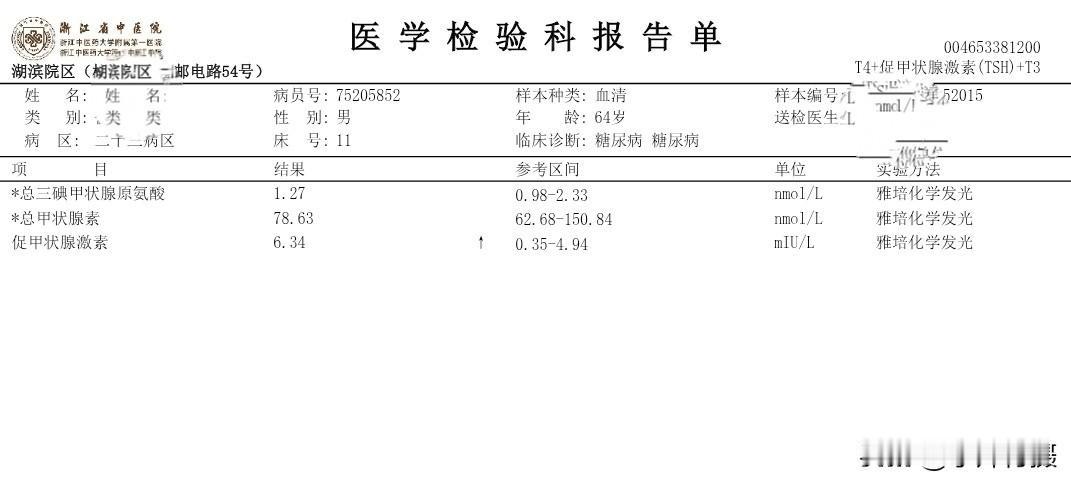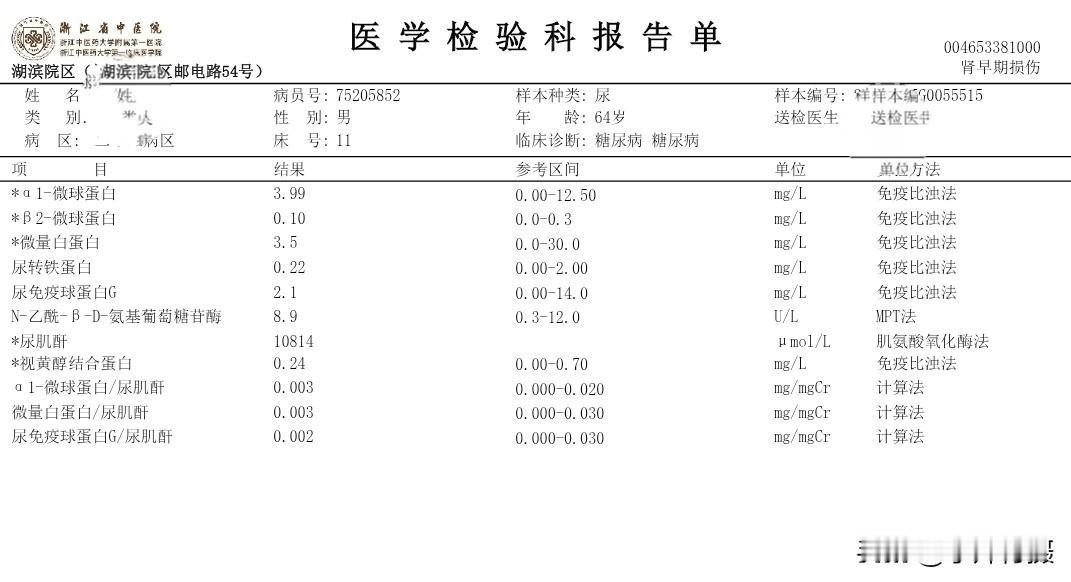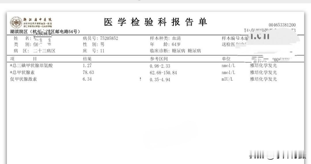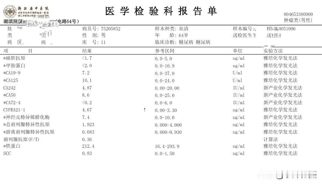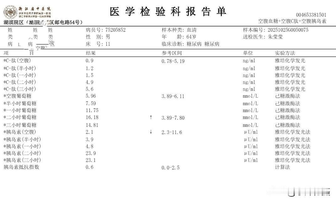 我住院第三次的日记 秋季生活打卡季 今天是住院入院第三次,这二天的有关糖尿病相关的检查已经结束。周末还没見主管医生团队来会诊。现检查项目大类和检查报告单结果将异常的指标列出,以免明天会诊时咨询病情、备忘指标如下: (一)生化类住院39项: 载脂蛋白B 0.6 白蛋白 38.7 碱性磷酸酶38 Y-谷氨酰转肽酶 9 唾液酸 448 (二)血常规+CRP 单核细胞% 10.9 血细胞比容 38.9 (三)T4+促甲状腺激素(TSH)+T3 促甲状腺激素 6.34 (四)空腹血糖+空腹C肽+空腹胰岛素 *空腹葡萄糖5.96 *半小时葡萄糖 7.59 *一小时葡萄糖11.75 *二小时葡萄糖16.78 *三小时葡萄糖14.81 *胰岛素(空腹)2.1*胰岛素(半小时) 3.9 *胰岛素(一小时)4.8*胰岛素(二小时)23.9*胰岛素(三小时)23.1胰岛素抵抗指数0.6 (五)肿瘤类(男性) CYFRA21-1 4.67 (六)骨代谢标志物3项(医保)(正常) (七)凝血6项(正常) (八)肌钙蛋白(正常) (九)肾早期损伤(正常) (十)尿常规 白细胞 11.1 (十一)大便常规+OB(正常) (十二)常规十二导联心电图(心电图室) 神经传导、神经电图(四肢): 超声内镜报告: