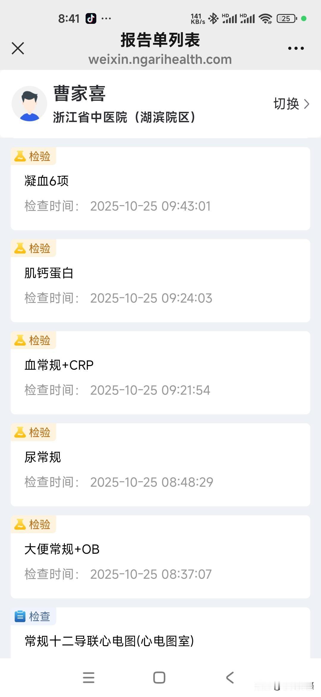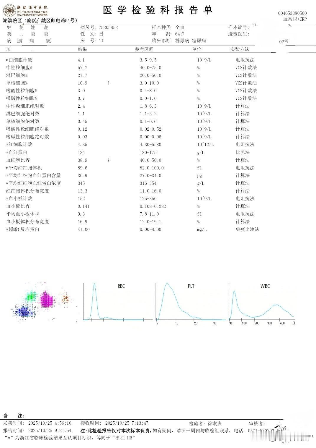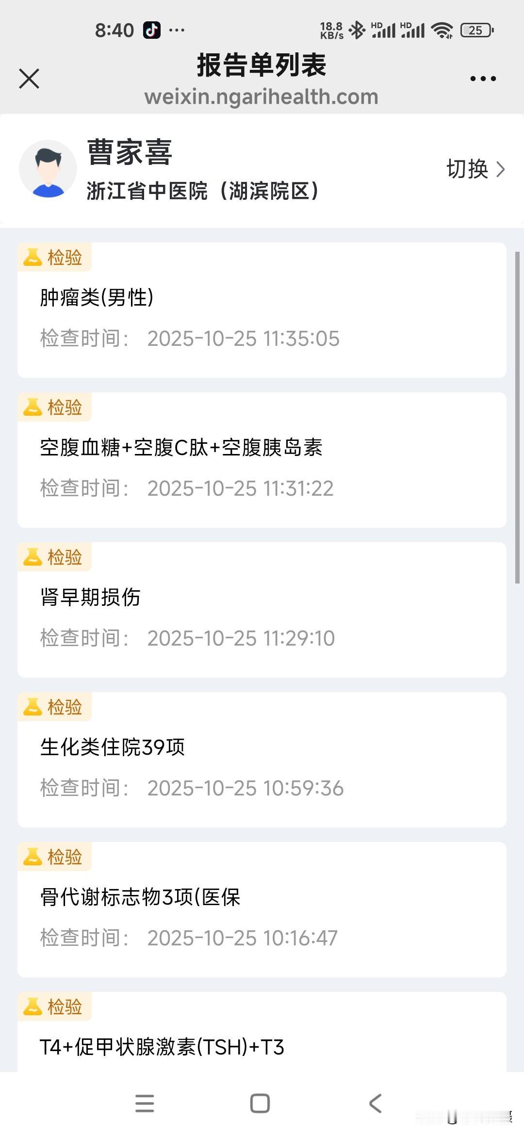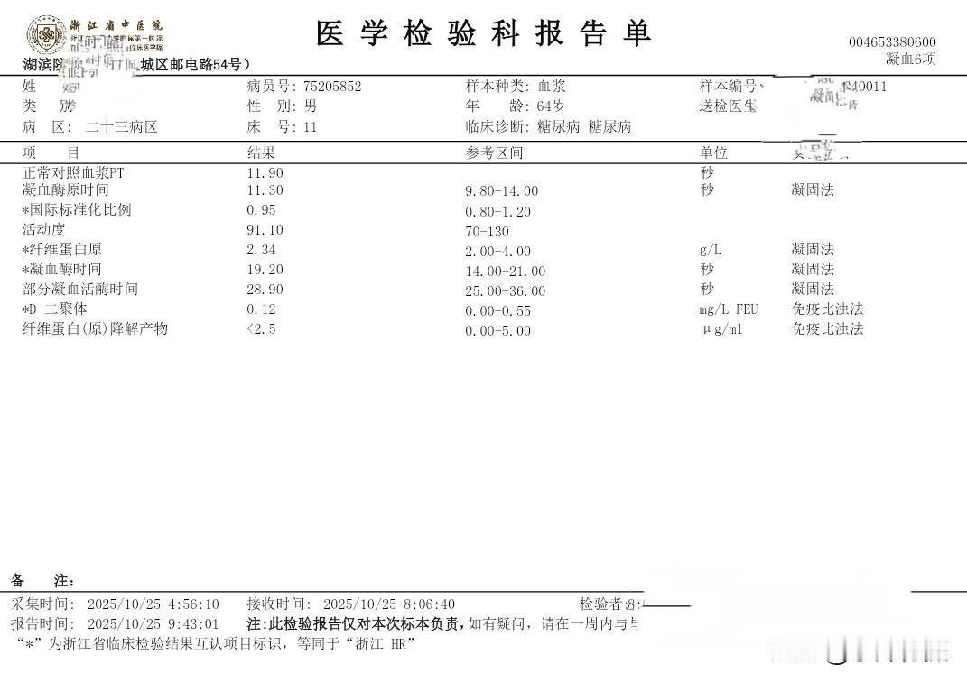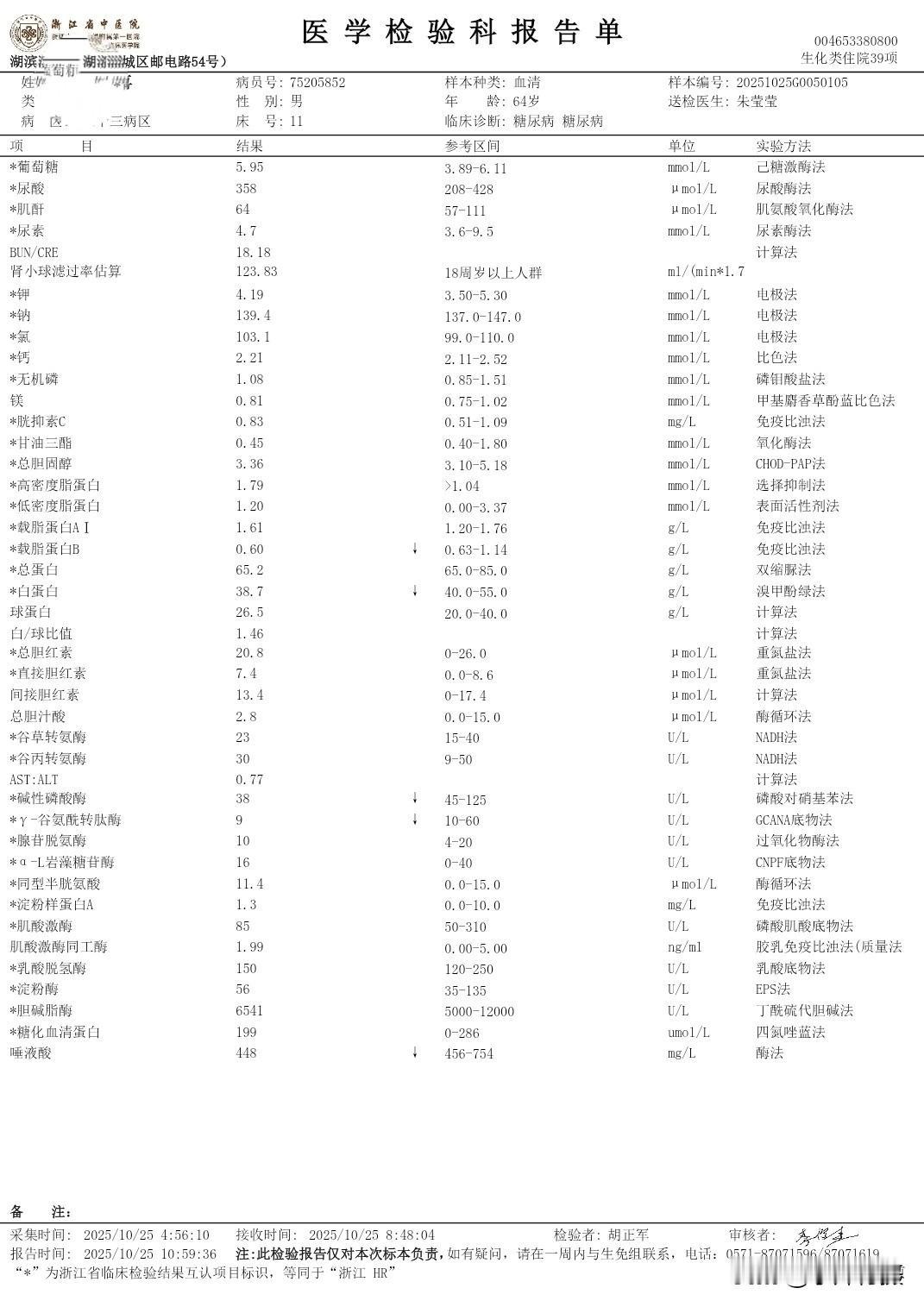 我住院第三次的日记 秋季生活打卡季 今天是住院入院第三次,这二天的有关糖尿病相关的检查已经结束。周末还没見主管医生团队来会诊。现检查项目大类和检查报告单结果将异常的指标列出,以免明天会诊时咨询病情、备忘指标如下: (一)生化类住院39项: 载脂蛋白B 0.6 白蛋白 38.7 碱性磷酸酶38 Y-谷氨酰转肽酶 9 唾液酸 448 (二)血常规+CRP 单核细胞% 10.9 血细胞比容 38.9 (三)T4+促甲状腺激素(TSH)+T3 促甲状腺激素 6.34 (四)空腹血糖+空腹C肽+空腹胰岛素 *空腹葡萄糖5.96 *半小时葡萄糖 7.59 *一小时葡萄糖11.75 *二小时葡萄糖16.78 *三小时葡萄糖14.81 *胰岛素(空腹)2.1*胰岛素(半小时) 3.9 *胰岛素(一小时)4.8*胰岛素(二小时)23.9*胰岛素(三小时)23.1胰岛素抵抗指数0.6 (五)肿瘤类(男性) CYFRA21-1 4.67 (六)骨代谢标志物3项(医保)(正常) (七)凝血6项(正常) (八)肌钙蛋白(正常) (九)肾早期损伤(正常) (十)尿常规 白细胞 11.1 (十一)大便常规+OB(正常) (十二)常规十二导联心电图(心电图室) 神经传导、神经电图(四肢): 超声内镜报告: