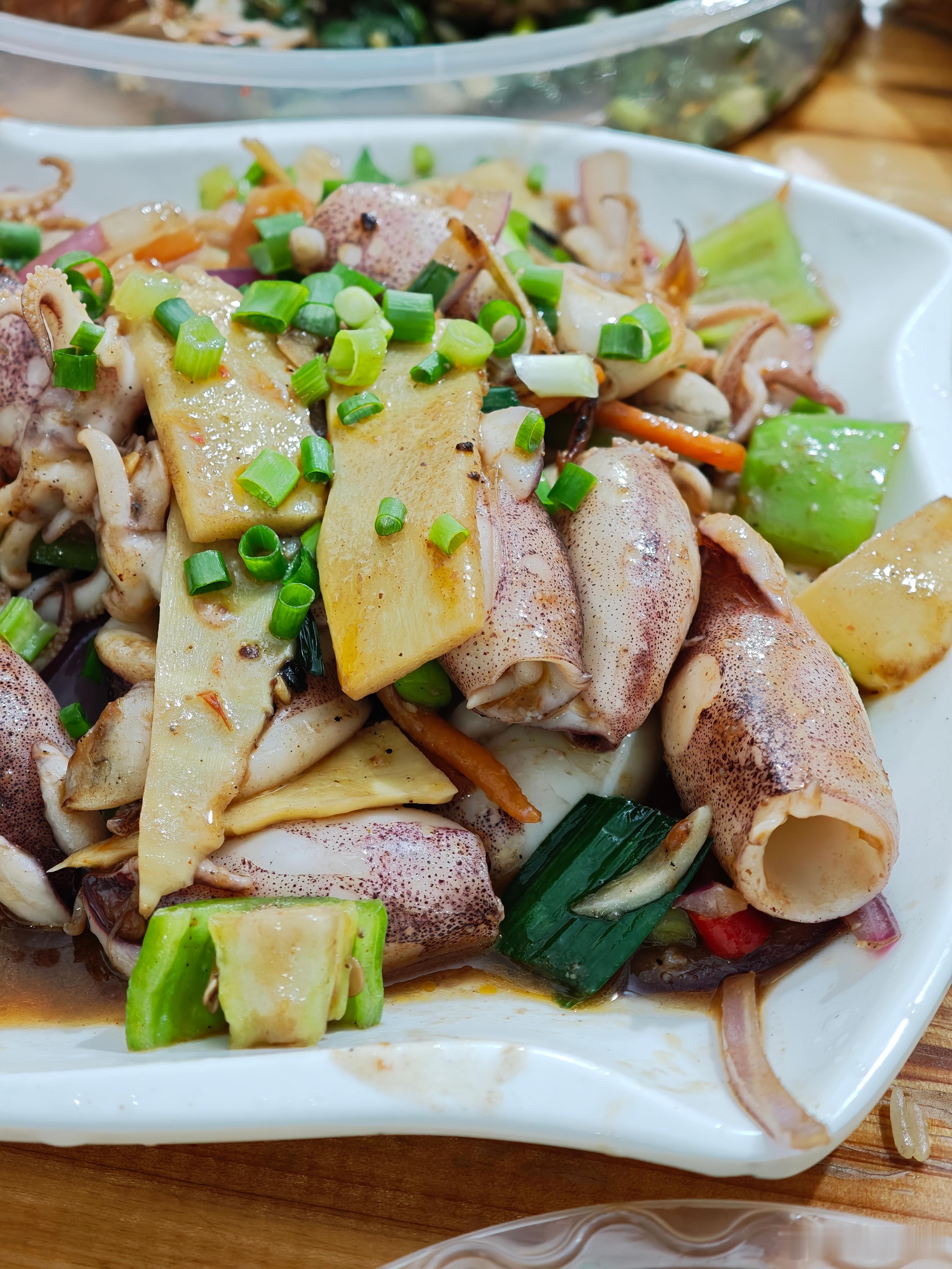 今晚吃的这家“小排档”真不错!海鲜都很新鲜,炒的也有水平,炒鱿鱼里面加的笋片,炒