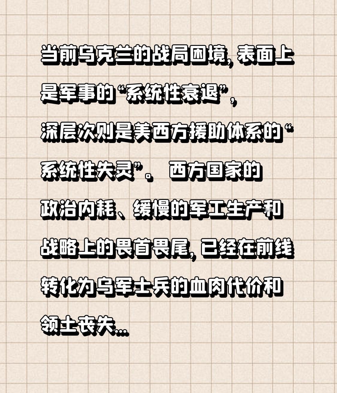 假如我有百万粉丝 今日热点我来评 当前乌克兰的战局困境,表面上是军事的“系统性衰退”,深层次则是美西方援助体系的“系统性失灵”。 西方国家的政治内耗、缓慢的军工生产和战略上的畏首畏尾,已经在前线转化为乌军士兵的血肉代价和领土丧失。 未来几个月,将是检验西方援乌决心和效率的关键窗口期。如果西方不能以“战时状态”来重新调整其援助策略,那么战场的天平将继续不可逆转地向俄罗斯倾斜。这场战争的结果,不仅将决定乌克兰的命运,也将重新定义冷战后欧洲的安全秩序和西方联盟的信誉。