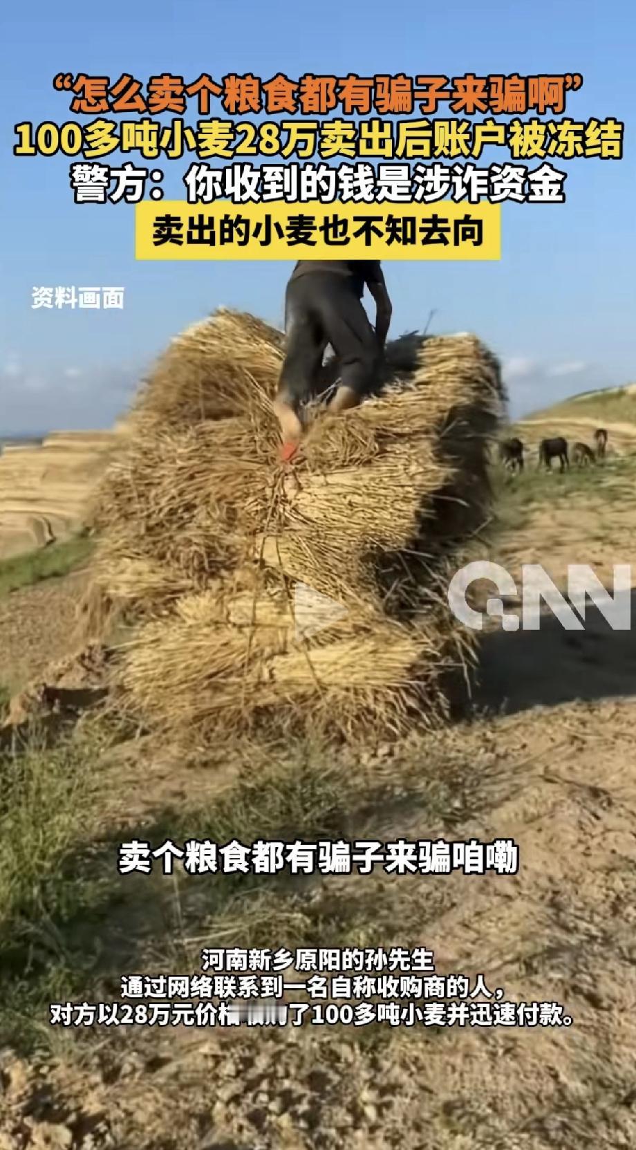 100多吨粮食,卖了28万,钱到账两天银行卡就被冻结了,原因是这些钱来路不正。 老百姓想好好做点生意,赚点钱,没想到还被诈骗分子给盯上了。100多吨的粮食好不容易卖出去了,令他们想不到的是,卖个粮食都有骗子来骗,看着真是心酸啊。 而这个骗子就是从网上联系他们的,说是收购粮食的,国开把粮食拉走了,很爽快的付了款,28万可不是一笔小数目,付的还很爽快,本以为是个爽快人,没想到竟然是个骗子。 银行卡被冻结后,他们了解才得知,这28万中存在一笔来路不正的资金,也就是说,这笔钱已经被冻结了,不能动了,粮食就被骗走了。 现在的骗子大都是不敢正儿八经过来找人的,都是从网络上主动联系人的,只要有人主动联系你谈及交易的,金额大的更应该注意了,不然就吃大亏了,就像这户人家一样,骗子就是主动联系的,他们过于轻信是因为这是粮食买卖,他们怎么也没想到骗子都深入到这种程度了,骗到粮食这方面了。 受骗者也不知道对方的身份,他们也不知道这些钱来路不正,他们是生意人,不知情,不知道这钱最后还能不能要回来,或者说,这些粮食能不能要回来,这么大几车粮食,查起来应该很好查,目标很大,只是不知道这些粮食最后会不会去与下一家交换,骗下一家。