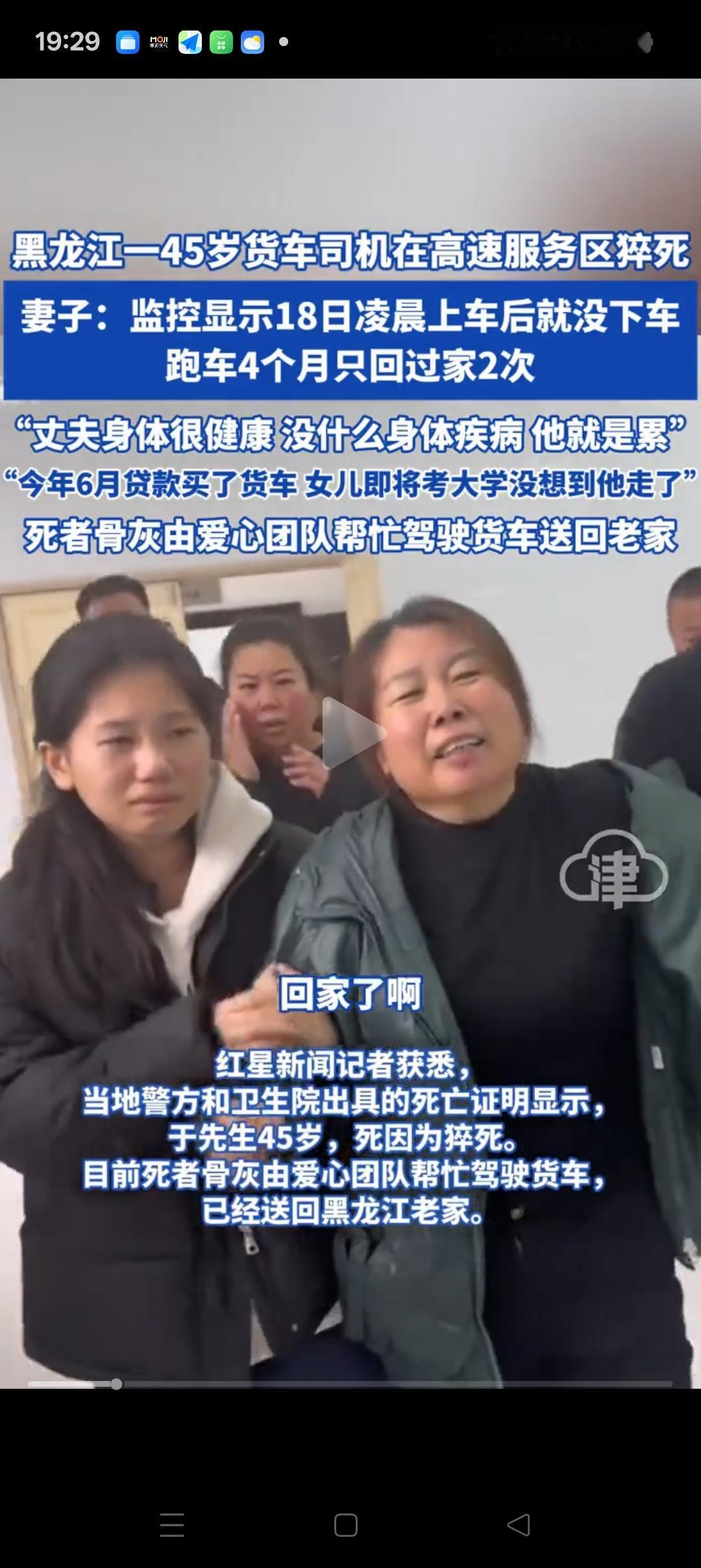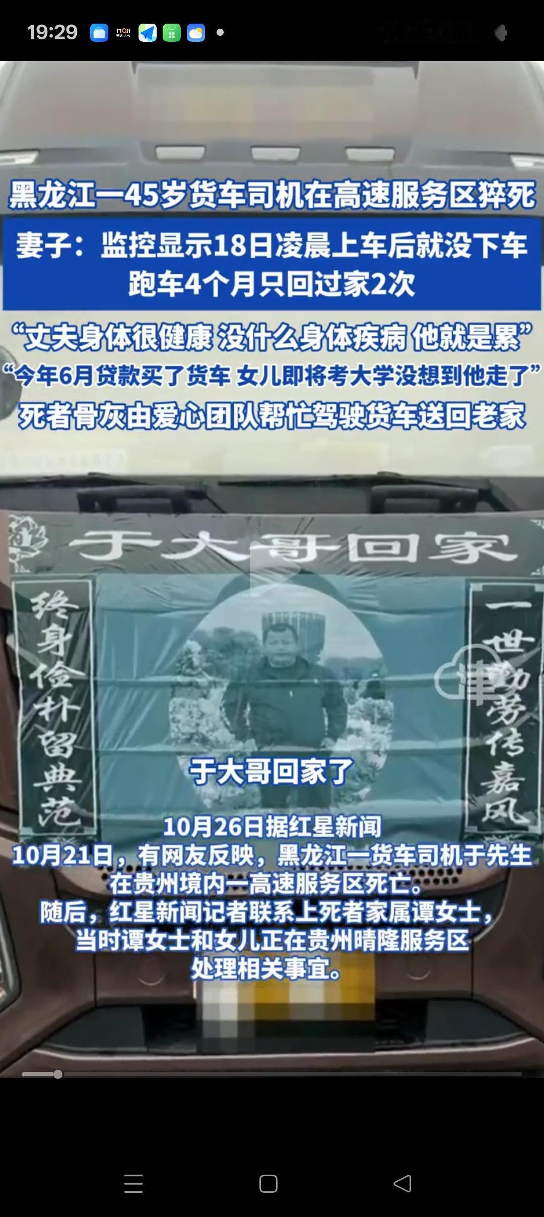 45岁货车司机余大哥在贵州服务区猝死,妻子哭着说:我知道他累,但没办法。女儿高三了,车也是贷款买的,他4个月就回家了2次,昨晚还通了电话呀! 据谭女士所说:老公接的最后一单是水果,晚上10点出发,凌晨1点到了贵州服务区休息,睡觉前还打了电话。到了早上9点联系不上,她就感觉不妙了 我表哥就是货车司机,跑了20年了,是真心累。大多数时候都只能睡几个小时,凌晨不睡觉赶时效的时候也不少,现在不仅有高血压,还有颈椎腰椎,都是赚的辛苦钱,还不敢去医院。 至于有些网友说的,可以请两个司机。那是根本不可能的,现在的价格根本支撑不起,可能会亏本。除非是夫妻一起做,但那样孩子没人管,更亏。 货车司机是家里的顶梁柱,也代表了很多普通人的生活状态。出门在外,请一定要善待他们[祈祷][祈祷] 于大哥,回家了。。