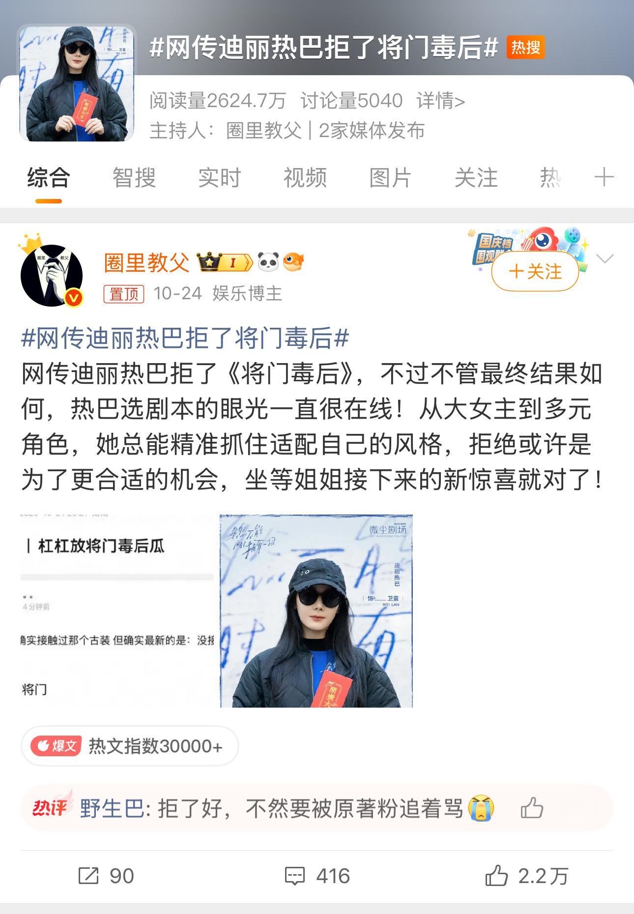 网传迪丽热巴拒了将门毒后将门毒后 王鹤棣《将门毒后》击鼓传花,主演传到王鹤棣、孟子义了!不过目前感觉还是遛人,最后主演定谁还不知道。[吹风车]