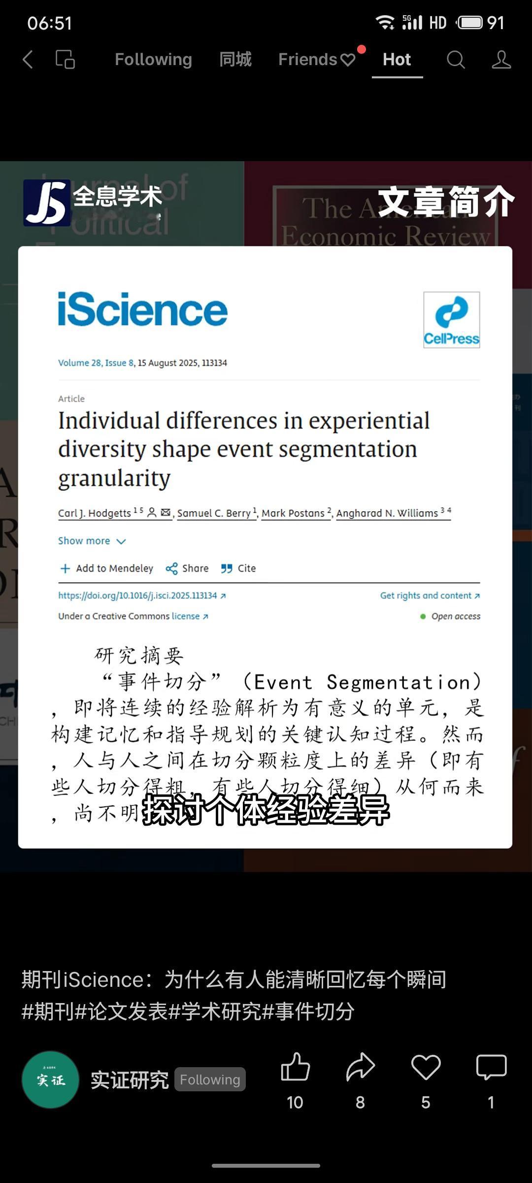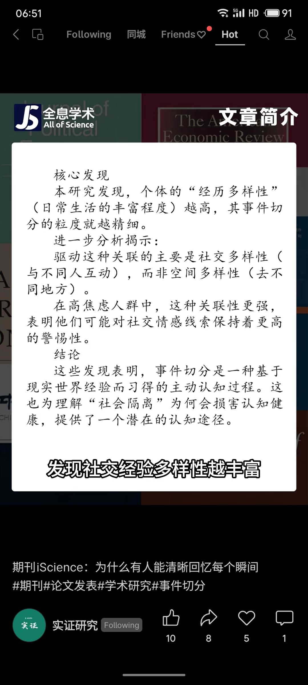 这项发表于《iScience》的研究表明,个体日常经历的多样性,尤其是社交互动的丰富程度,会影响其“事件切分”的粒度——即把连续经验解析为记忆单元的细致程度。社交多样性(而非空间多样性)是主要驱动因素,且此关联在高焦虑人群中更强。研究提示,事件切分是一种习得的主动认知过程,这为理解社会隔离损害认知健康提供了新视角。
