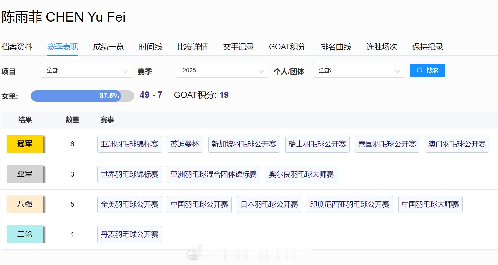 六个冠军:亚洲羽毛球锦标赛 苏迪曼杯 新加坡羽毛球公开赛 瑞士羽毛球公开赛 泰国羽毛球公开赛 澳门羽毛球公开赛