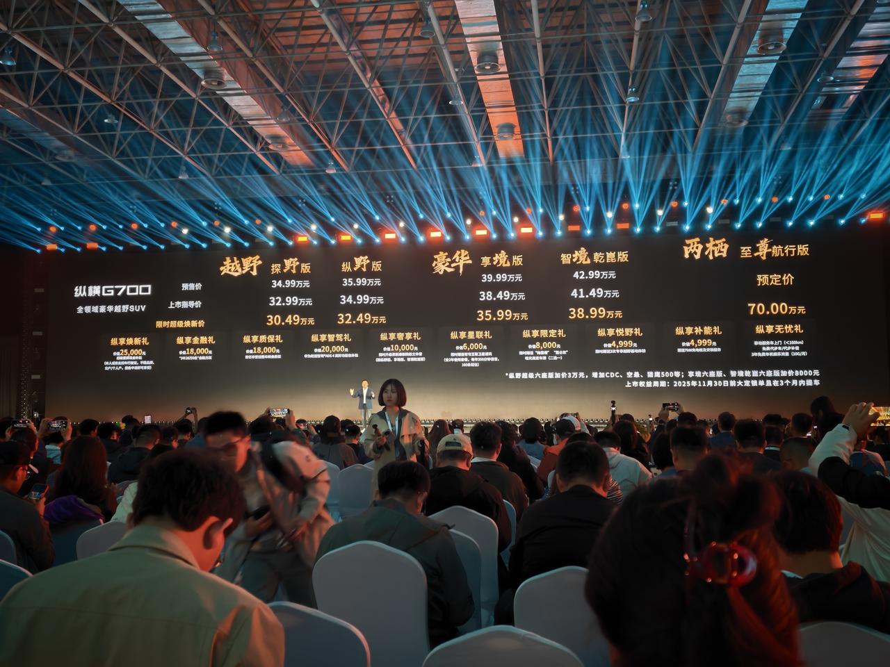 纵横G700发布上市,上市指导价32.99万至41.49万,至尊航行版(水陆两栖) 预定价70万,还有很多专属改装版。 车长将近5米2,颜值能打,很有竞争力的一款硬派越野车,2.0TD发动机浸泡在水中24小时后可以正常启动,有P1发电机,P3前电机,2档DHT混动变速箱,还有后桥2档P3电机,综合功率665kW。 使用宁德时代电池,CLTC纯电续航150km,还搭载了华为乾崑ADS 4的辅助驾驶,也可以选择猎鹰500的方案。