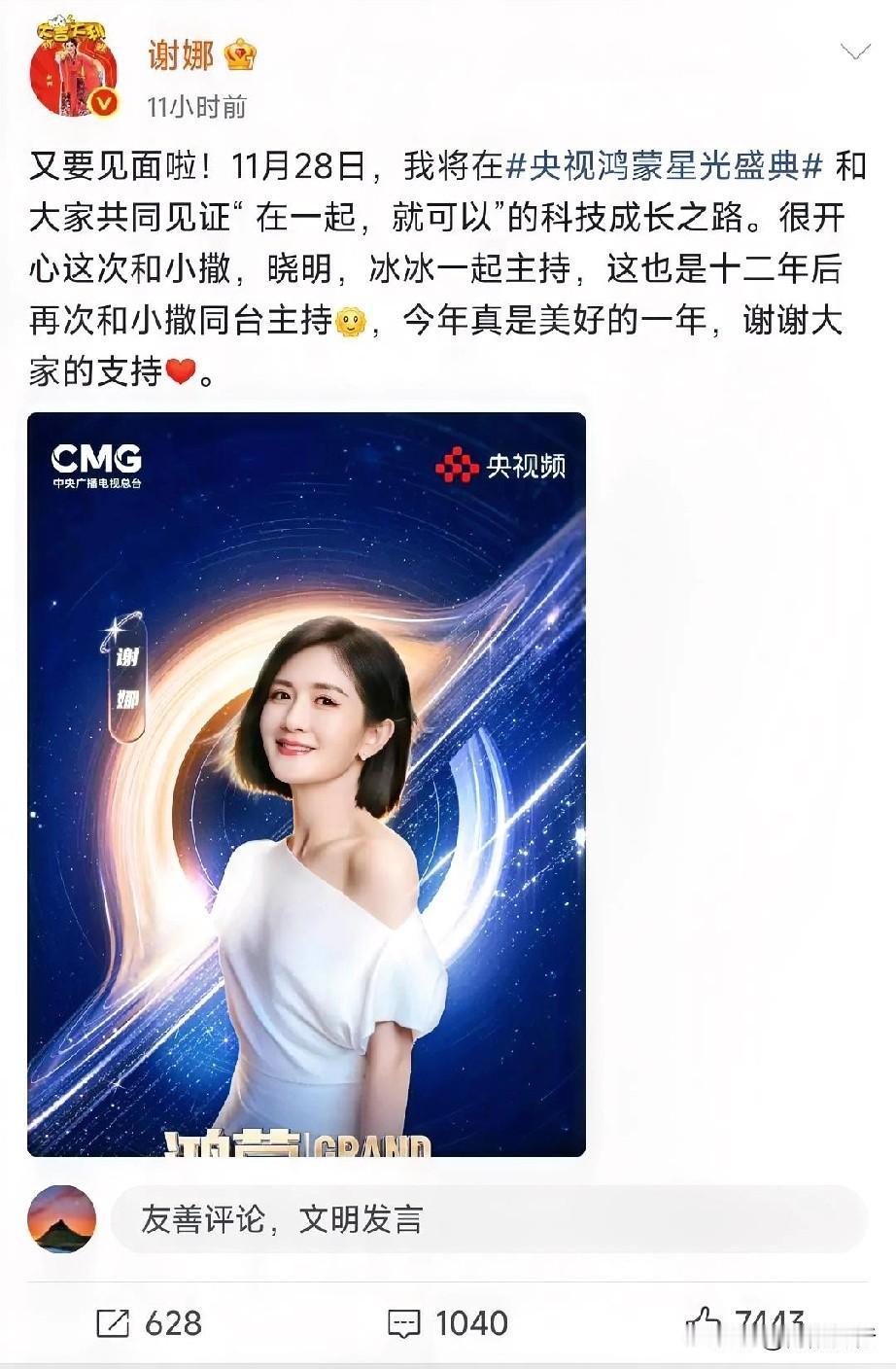 这一夜, 张杰躲在被窝里笑出声, 因为谢娜,再次被央视邀约去主持,太有面了! 距离主持央视秋晚才刚过去20天,谢娜又收到央视邀约,下个月28号要主持鸿蒙星光盛典,搭档的还是撒贝宁、黄晓明和王冰冰。这四位往台上一站,撒贝宁控场稳,王冰冰气质柔,黄晓明自带幽默劲儿,再加上谢娜的活力,看点直接拉满! 说实话,44岁还能在主持路上不断突破,从《快乐大本营》到央视舞台,谢娜靠的不只是运气,更是背后的坚持和专业。央视选主持人一向严格,能两次邀请她,就是对她能力最直接的认可。 我觉得优秀的人从来不会被局限,谢娜就是最好的例子。你们说,这阵容是不是今年最让人期待的主持组合?