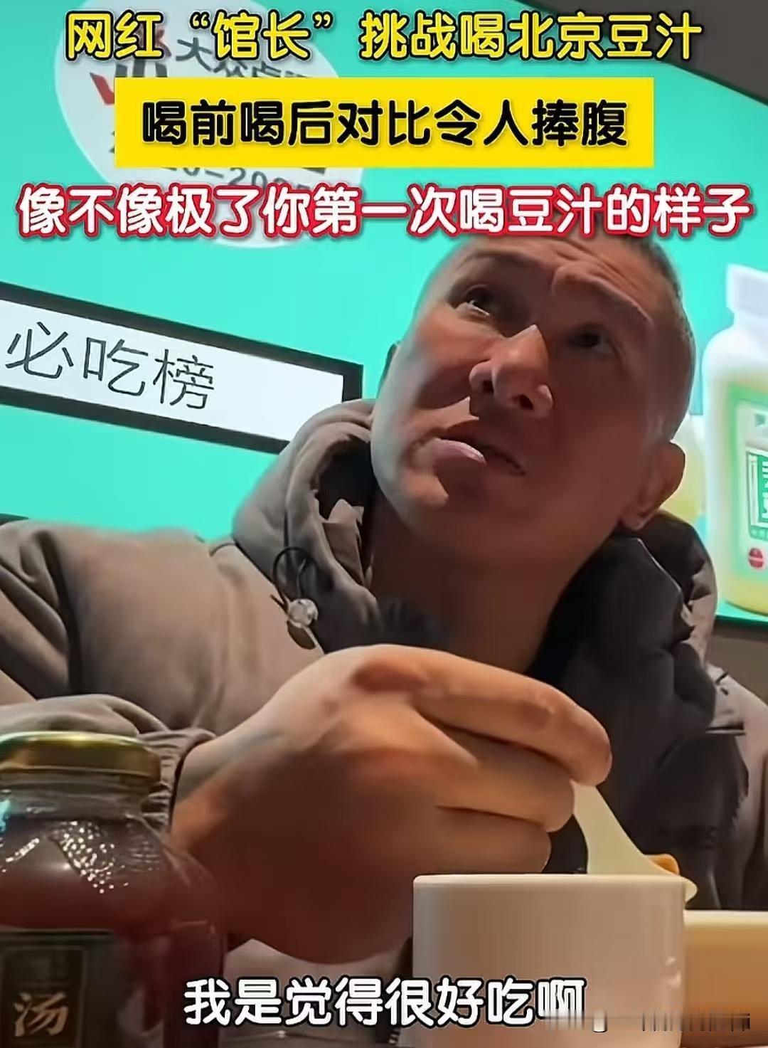 馆长这次要被自己打脸了! 他之前直播时说自己这趟去北京绝不会喝豆汁的,而且对豆汁满脸嫌弃!可是 这两天到了北京之后,他喝起豆汁来了,还咽得这么顺溜。 个人感觉这豆汁儿酸得冲鼻,发酵味直窜天灵盖,我上次尝了一口差点吐,喝了直皱眉。 跑谁能想到他喝得跟喝甜粥似的。 老北京人喝这玩意儿上瘾,说越酸越得劲,有的能连喝六碗, 他要不是打小喜欢喝醋,要不就是忍功了得,不然真没法解释他咋能面不改色说“挺好喝”。 就这股子“地道”劲,馆长让人佩服呀,大家对豆汁儿啥态度呢?