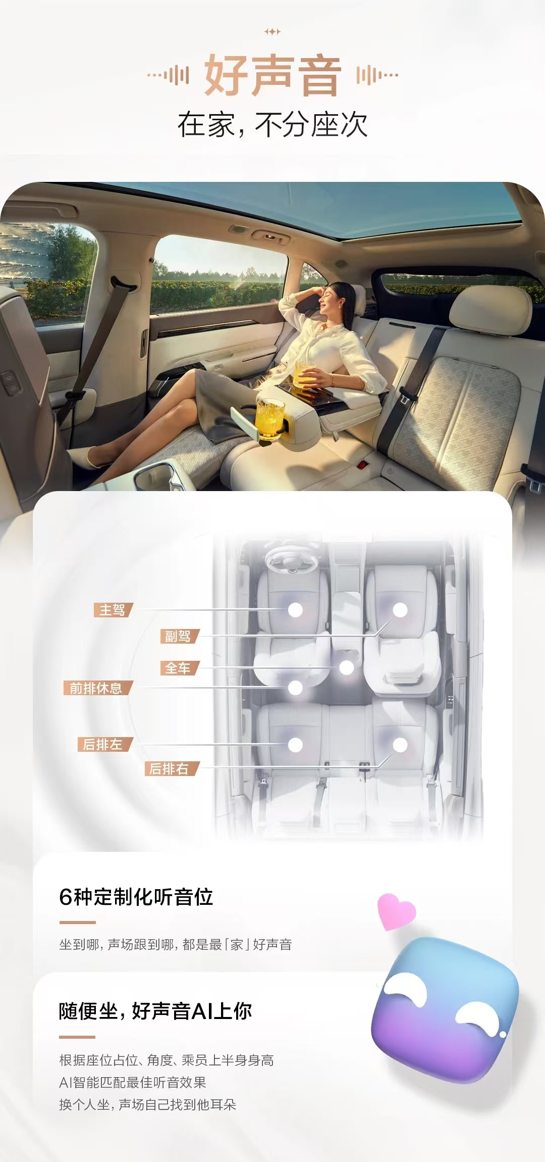 更贴心的是,不管你坐主驾、副驾还是后排,都能选专属的听音位,AI还能自动给你调好音效;想换风格也有6种模式可选,摇滚、爵士、影院感都能安排。