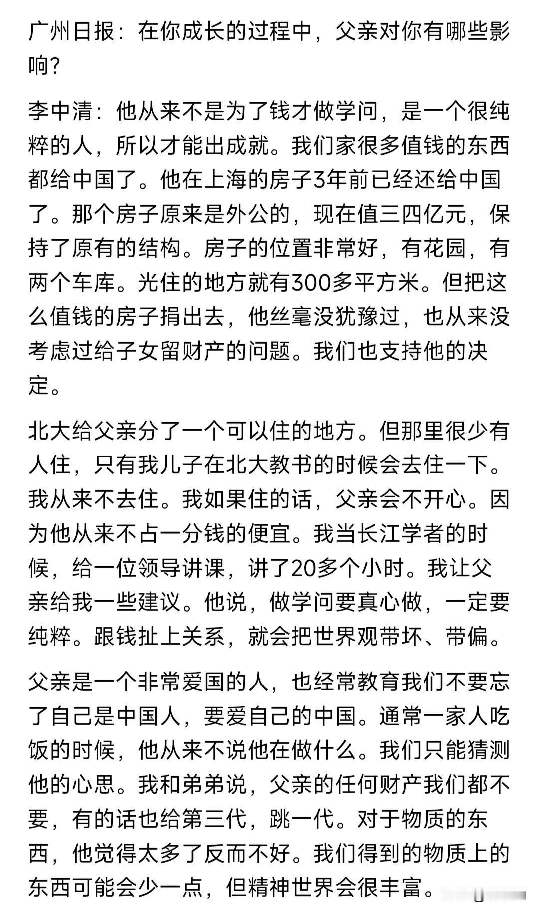 这才叫真洒脱!上海有套价值三四个亿的别墅,诺贝尔奖得主李政道说捐就捐了。更让人意想不到的是,这房子还不是他自己买的,是岳父当年给的!儿子李中清接受采访时直言:“爸爸不会给子女留遗产。”网友炸了:“我缺的不是钱,是这份境界!” (来源:广州日报采访报道) 说实话,第一次听到这事儿,我愣住了。三四个亿啊!在上海,这得是什么概念呀?普通人一个月赚一万块,不吃不喝也得攒三千多年才够。可李政道呢,眼睛都不眨一下,直接捐给了上海交通大学。 关键是,这房子的来历更有意思。这套别墅原本是李政道夫人秦惠莙的父亲留下的,算是岳父家的财产。按咱们普通人的想法,这可是娘家的东西,就算要处理,怎么也得跟妻子商量商量,或者留给孩子们吧? 可李政道压根儿不是这么想的。他对物质真的是超级无所谓,用他儿子李中清的话说:“爸爸对钱真的没啥概念。” 这话可不是随便说说的。你想啊,一个能拿诺贝尔奖的人,要赚钱那还不容易?随便挂个名、出席个活动,钱不就哗哗来了?可李政道从来不干这事儿。他总说做学问就要纯粹,不要追名逐利。 有人可能觉得这是场面话,谁不会说几句漂亮话呢?但人家是真的做到了。 想想咱们身边,多少人为了一套房子闹的鸡犬不宁,兄弟姐妹反目成仇的,父母子女对簿公堂的,这样的例子还少吗?可人家李政道,三四个亿的豪宅说捐就捐,还是捐给学校,用来培养人才,推动科研。 这份格局,真的不是一般人能有的。我特别留意到一个细节:李中清说父亲“不留遗产给子女。”这话听着有点无情,但仔细想想,这不正是一份大爱吗? 李政道给孩子们留下的,不是躺在银行账户里的数字,而是独立生活的能力、做人做事的品格、他用自己的行动告诉孩子们:人活着,不是为了攒钱,而是为了做点有意义的事。 现在很多有钱人,拼了命给孩子留财产,生怕孩子将来受苦。可结果呢,孩子反而被养废了,成了啃老的“巨婴”。李政道这种做法,看似狠心,实际却是聪明之举。 有网友说:“难怪人家能拿诺贝尔奖,光这份对钱的淡定,我就输在起跑线上了。”还有人说:“我也想学李政道,可惜我没有三四个亿。” 其实,咱们普通人学不了李政道的豪气,但能学他的心态。 钱是身外之物,够用就行。与其把所有精力都花在赚钱、攒钱上,不如多想想怎么让自己活得更有价值。 李政道这辈子,没把心思放在房子和钱上,而是专注于物理研究,最终在31岁就拿下诺贝尔奖,成为华人的骄傲。他的名字,永远留在了科学史上。 反观那些整天盘算着如何发财,如何给子女多留点家产的人,最后留下的,可能只是一堆冷冰冰的数字和一地鸡毛的家庭纠纷。 富有从来不是账户上有多少钱,而是心里有多少追求。李政道的洒脱,让我们看到了一个科学家的纯粹,也让我们明白:人生最贵的,不是豪宅名车,而是内心充实和精神的自由。 这样的人生,才叫真的有钱!你们觉得呢?