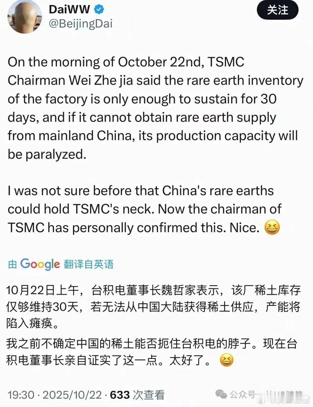 我们需以稀土这一"工业维生素"为依托,为台积电布置一份关乎公平与责任的"家庭作业"。 这份作业的第一道题,是坚守产能布局的公平底线!台积电必须立即停止在美国的新增工厂建设与投资。美国以《国防生产法》施压,台积电便拱手奉上巨额投资,让全球芯片产能分配沦为地缘政治的附庸;而中国作为台积电最重要的资源供给方与关键市场,理应拥有同等的话语权。据说美国工厂因稀土短缺已出现库存告急的困境,这恰恰证明其产能布局的非理性。停止赴美扩产,不是限制企业发展,而是倒逼其回归商业本质,拒绝成为科技霸权的工具。美国本身已经制造业空心化,台积电自己也公开表达过美国政客要求台积电投资美国不合理,那么就停下来吧。