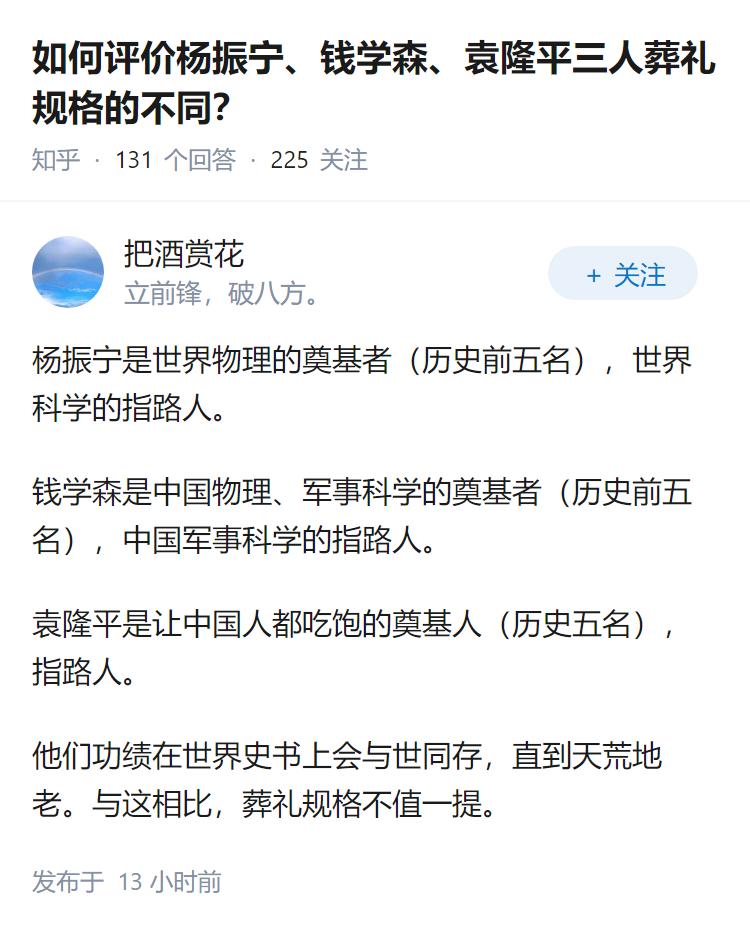 如何评价杨振宁、钱学森、袁隆平三人葬礼规格的不同?