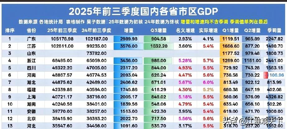 广东,江苏,山东,浙江会是国内仅有的4个超10万亿经济大省 普通人视角看广东,江苏, 山东,浙江这4个经济大省,会有点感慨,中国经济基本就是靠粵苏鲁浙+京沪在撑着(京沪三产强),因为它们6个省市的经济体量占比国内份额很大。 2025年,山东和浙江gdp会迈入10万亿大关,中国同时会有广东,江苏,山东,浙江4个超10万亿体量的经济大省,并且在近几年会形成断层,短期内再无省份可达到10万亿大关。 2025年前三季度,广东和江苏名义增速虽然只有2.9-3.6%之间,但是它们的体量太大了,一省超一国都不夸张,山东还没有公布数据,浙江名义增速5.28%,又快又稳,浙江常住才6600万,是4个经济大省里人口最少的,北京,上海,一南一北两个直辖市,就是中国服务业的龙头城市。 经济大省扛大梁,粵,苏,鲁,浙,沪,京6省市对中国经济发展贡献巨大。各省GDP排行 浙江省 浙江经济 省市经济排名 江苏经济 山东浙江GDP