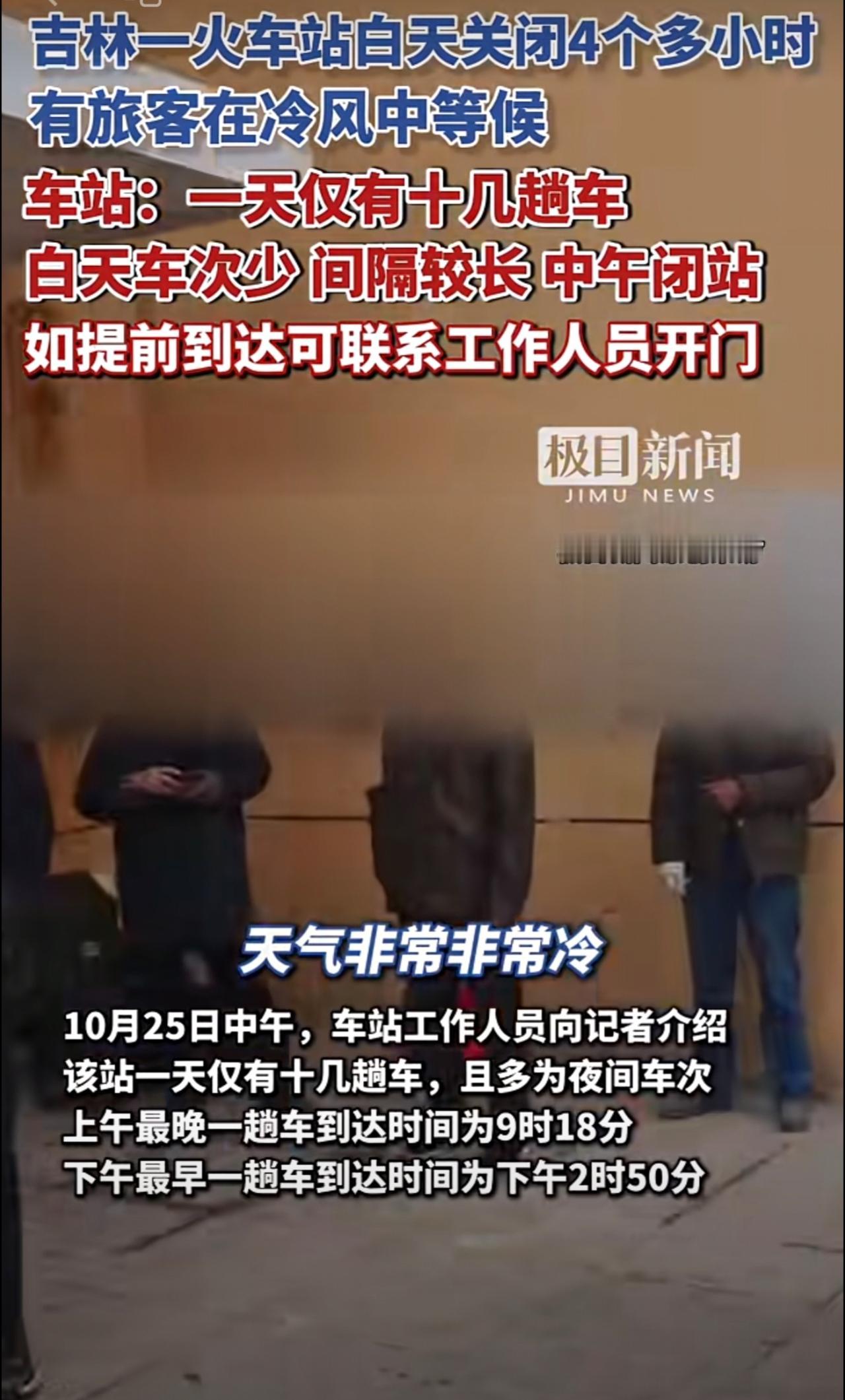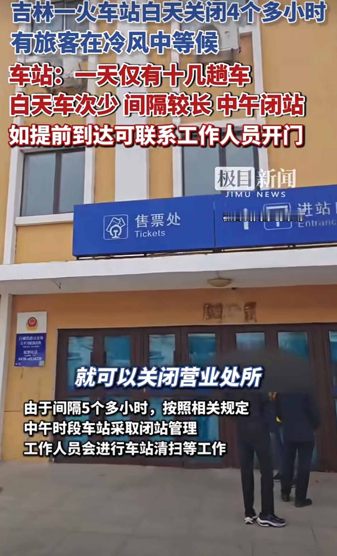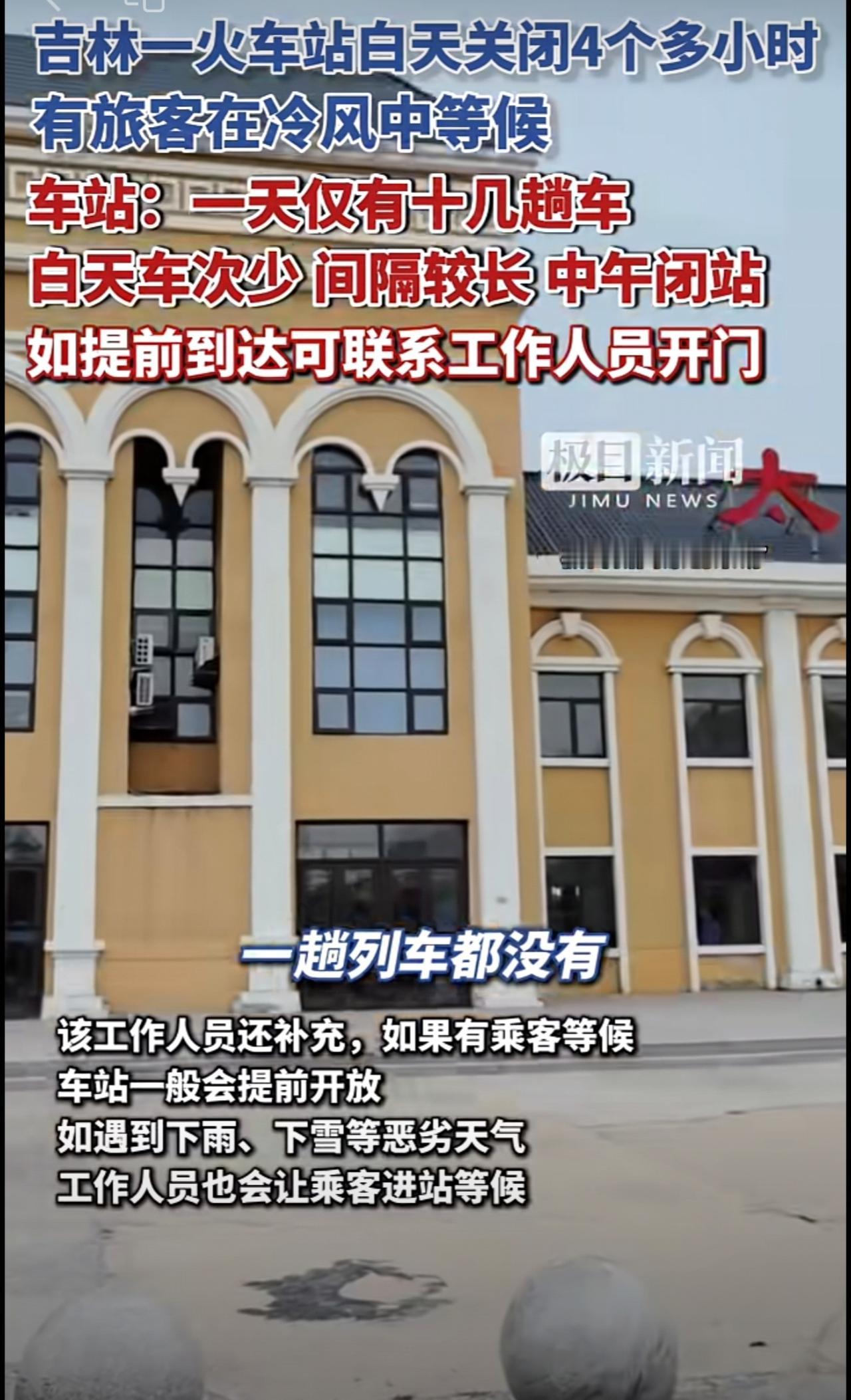 吉林一火车站白天关闭4个多小时,有旅客在冷风中等候。车站:一天仅有十几趟车,白天车次少,间隔较长,中午闭站,如提前到达可联系工作人员开门。
