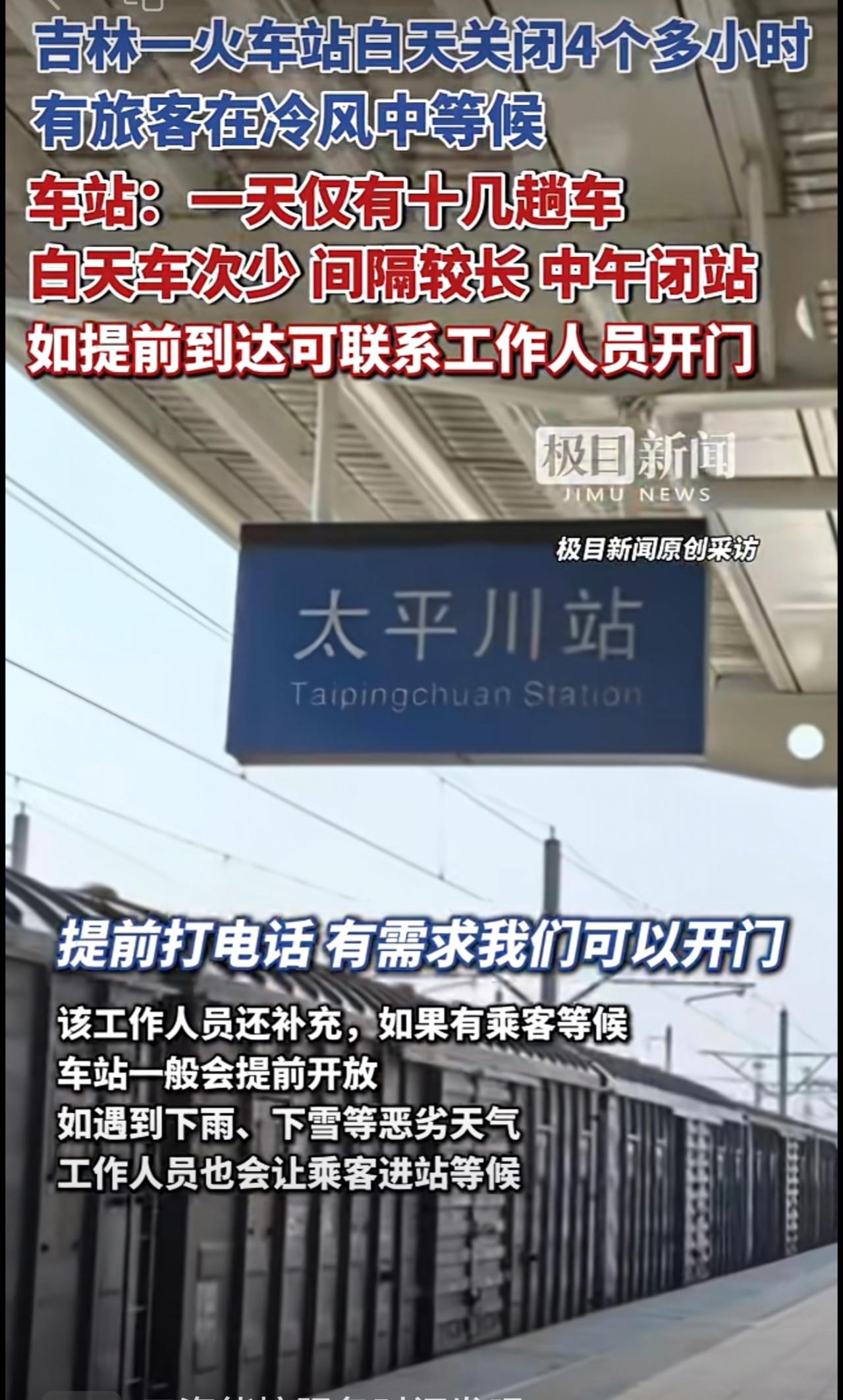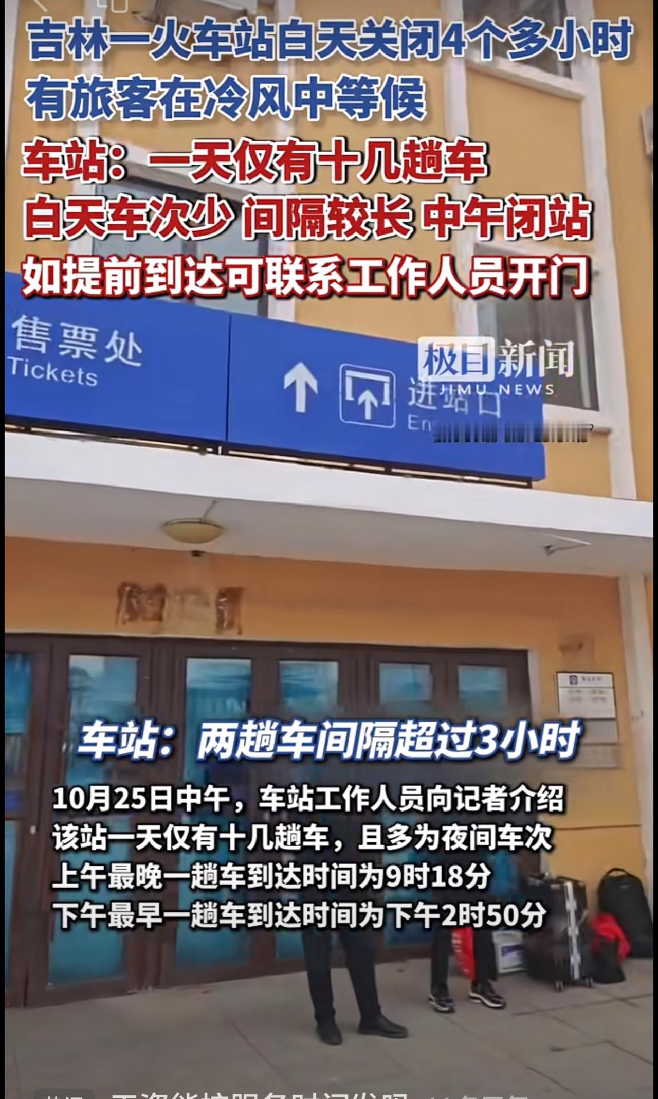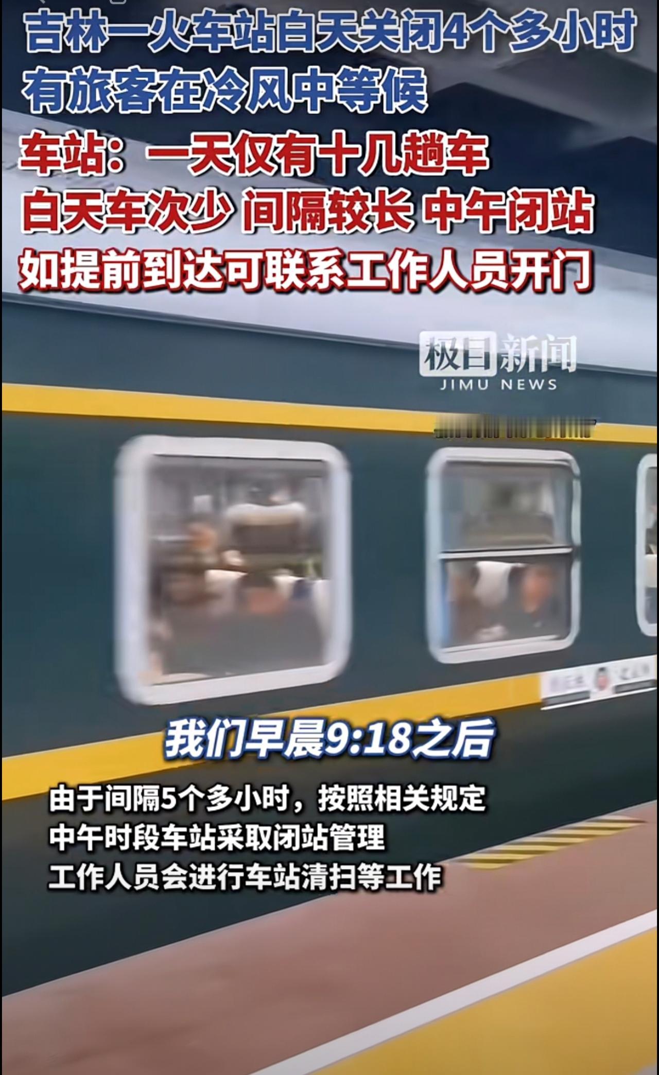 吉林一火车站白天关闭4个多小时,有旅客在冷风中等候。车站:一天仅有十几趟车,白天车次少,间隔较长,中午闭站,如提前到达可联系工作人员开门。