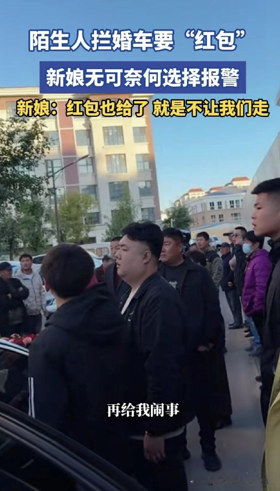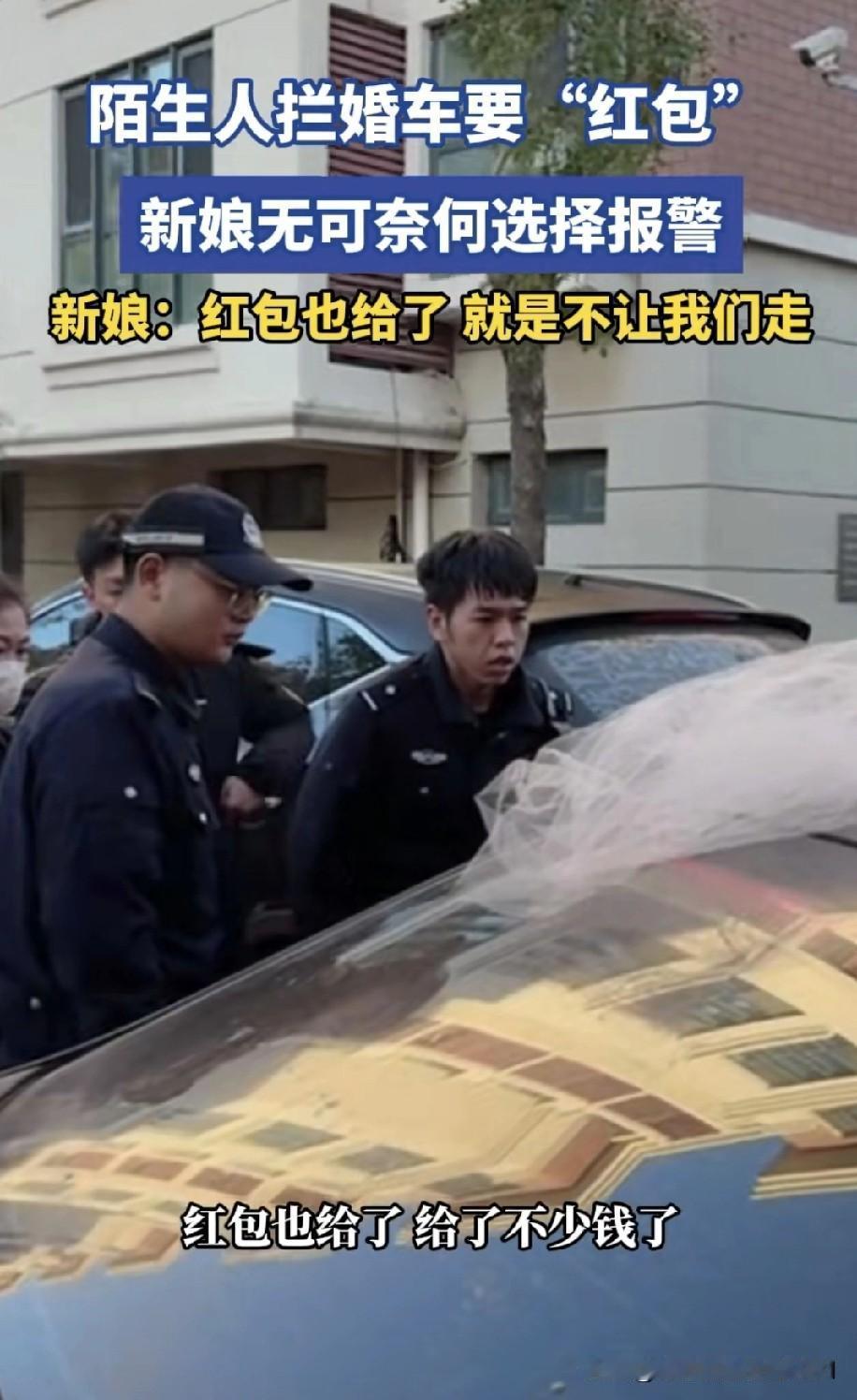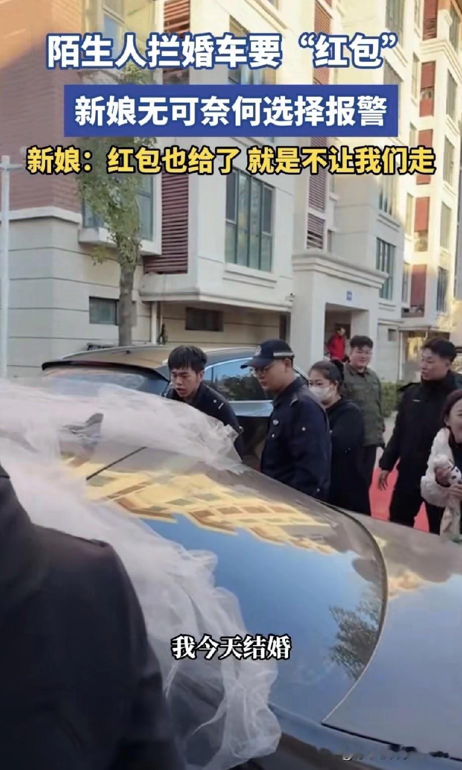 河北一位新娘在结婚途中,遭遇陌生人拦截婚车,不给红包和烟就不让走。新娘给了不少钱,对方仍不罢休,无奈之下新娘选择报警。警察赶到现场,新娘诉说自己怀有身孕,心脏也不好,直言这些人的行为完全就是拦路抢劫。 拦婚车究竟是哪个地方的风俗?非亲非故的,有什么脸面跟人家要几条香烟,人家给你一根香烟就已经很给面子了。陌生人拦婚车索要红包,这哪是什么“讨喜”,分明是趁喜打劫! 这位新娘果断报警的举动太飒了,这波操作直接刹住了“拦路要钱”的歪风。那些闹婚的人实在不地道。吃颗糖、抽根烟,主家自然不会拒绝,毕竟结婚是大喜的日子。可他们这么做,不就是给人家添堵吗?这些人真让人讨厌。