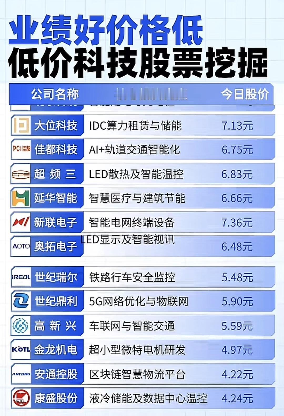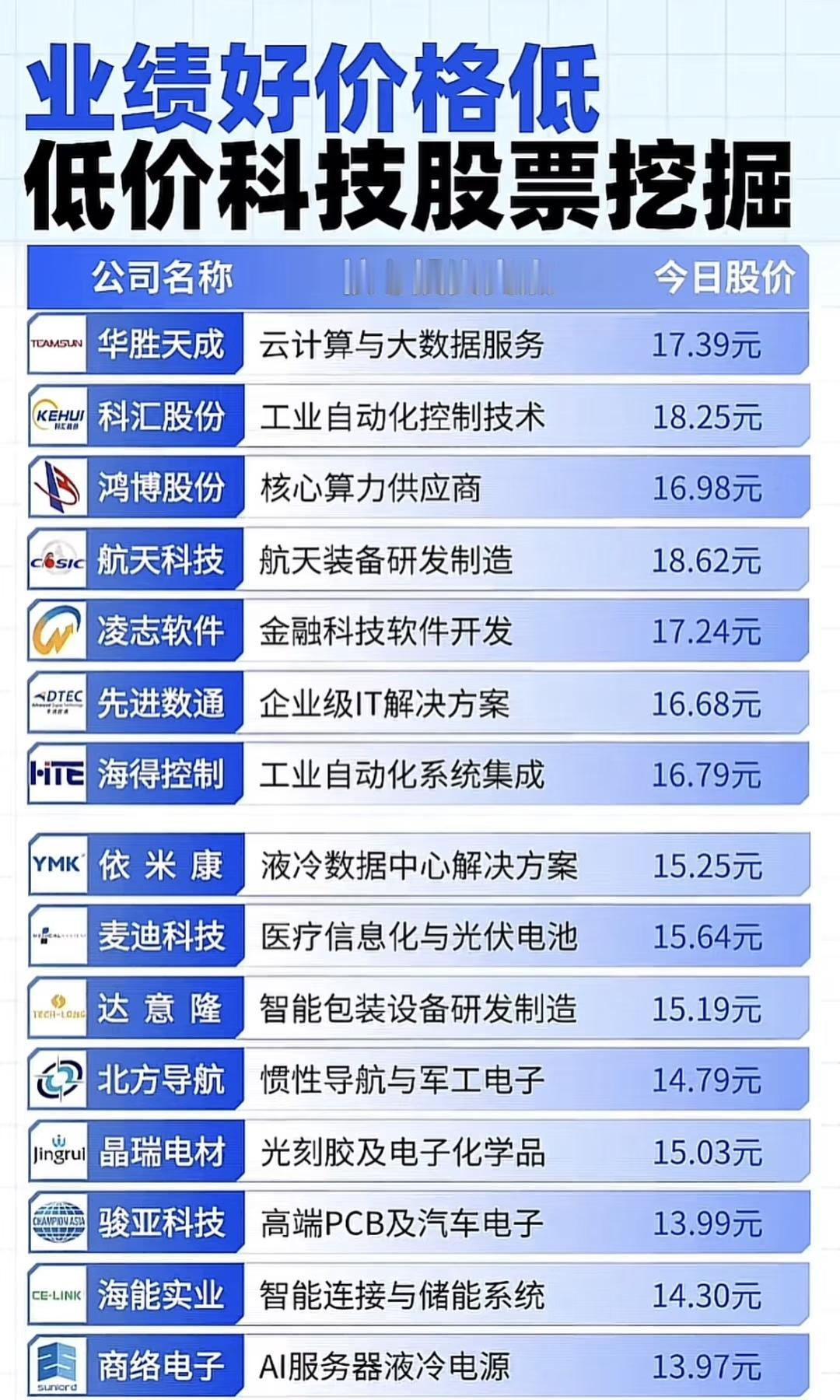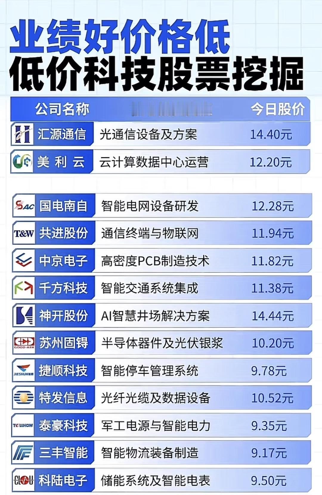 “业绩好价格低 低价科技股票挖掘”,展示了多只当前股价相对较低但具备一定科技含量与核心业务亮点的上市公司,供投资者参考。 共整理了超过50家科技类上市公司,涵盖多个细分领域,包括但不限于: - 半导体与芯片(如有研新材、万业企业、新相微、晶瑞电材、苏州固锝等),涉及高端半导体材料、核心设备研发、显示驱动芯片、光刻胶及电子化学品等; - 通信与网络设备(如汇源通信、共进股份、特发信息、世纪鼎利、IRSE世纪瑞尔等),包括光通信、光纤光缆、5G网络优化、铁路通信安全监控等; - 云计算与大数据(如华胜天成、商络电子、美利云、大位科技、PCI佳都等),涉及云计算服务、AI服务器液冷电源、IDC算力租赁、AI+轨道交通等; - 智能装备与自动化(如海得控制、科汇股份、三丰智能、泰豪科技、金龙机电等),包括工业自动化控制、智能包装设备、智能物流装备、微特电机等; - 智能交通与汽车电子(如千方科技、中京电子、金麒麟、佳都等),涉及智能交通系统、高密度PCB、汽车制动或显示系统等; - 医疗与健康信息化(如久远银海、麦迪科技等),提供医疗信息化解决方案,部分还涉及光伏等新能源应用; - 电力与储能(如国电南自、科陆电子、安通控股、康盛股份等),包括智能电网设备、储能系统、液冷储能、区块链智慧物流等; - 其他新兴科技领域(如海兰信的海洋智能装备、光华科技的新能源材料、依米康的液冷数据中心、捷顺科技的智能停车系统等)。 每张图片中列出的公司都标明了其核心投资亮点与最新的每股价格,股价范围大致在4元多至23元多之间,整体偏向低价区间,意在挖掘“业绩尚可但估值较低”的科技类标的,为投资者提供潜在关注对象。