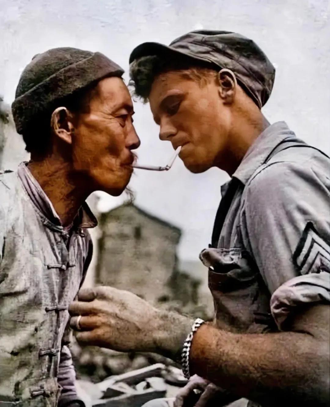 二战时,中美为抗日结盟。美国大兵向中国劳工借火搞笑抓拍瞬间。