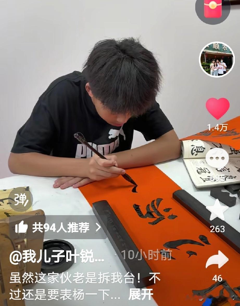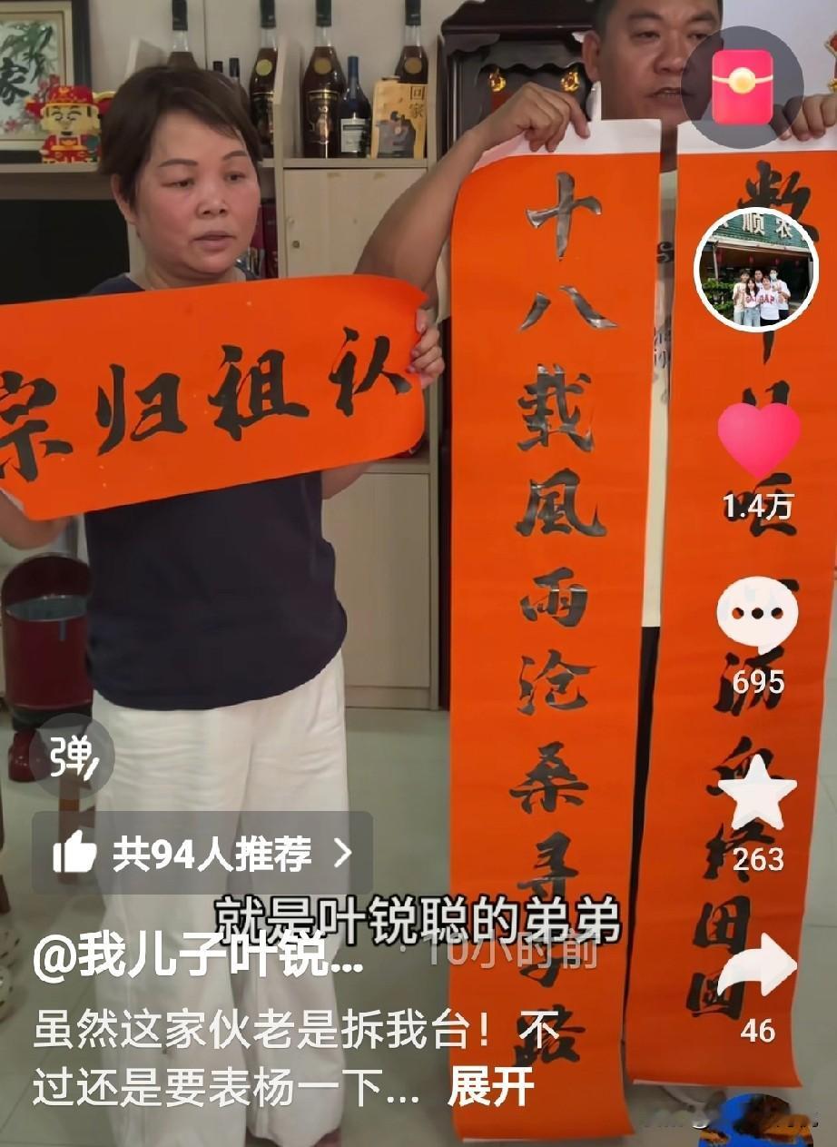 叶锐聪的弟弟了不起啊, 小小的年纪能写上一手好的毛笔字, 叶锐聪妈妈讲,弟弟已经挥霍了好多纸张才完成的,从前几日七点开始写的, 对联上写的是 上联:十八载风雨沧桑寻子路, 下联:数千日呕心沥血终团圆, 横批:认祖归宗 这孩子写的太好了, 记得邓博回家的对联 也是弟弟写的[泪奔] 有网友说:看是一副对联 ,实际是弟弟对哥哥的爱!爱回家,幸福来敲门![鼓掌]