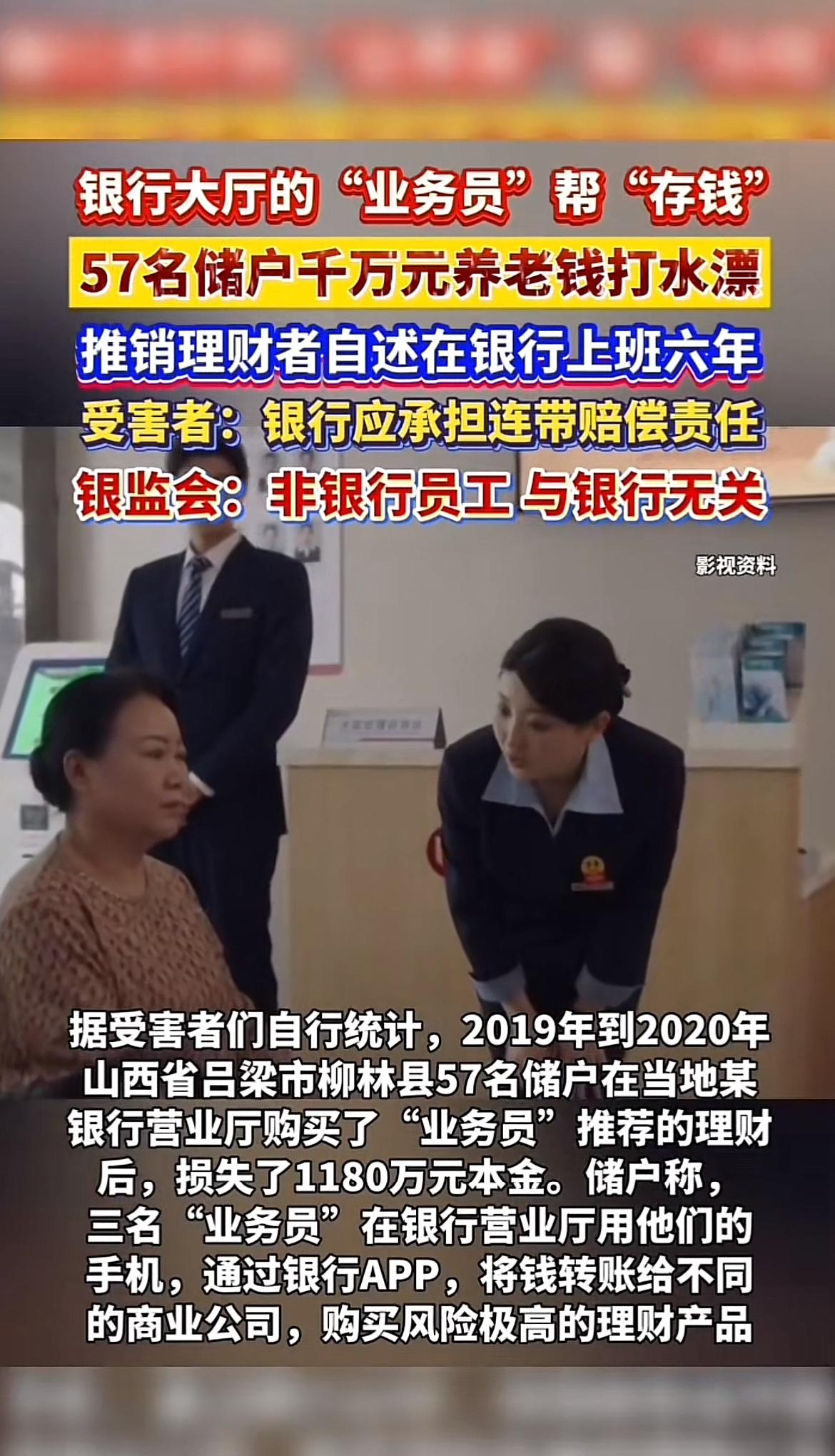 山西吕梁柳林县的这事儿太让人痛心了。2019 - 2020年,57名中老年储户在当地某银行营业厅,被穿银行工服的“业务员”骗走1180万养老钱。像72岁的王慧芳,一辈子攒的30万就这么没了。“业务员”用“高息存款”“银行活动”当幌子,在银行营业厅用储户手机通过银行APP转账买高风险理财。 事发5年损失都没追回。储户觉得银行该担责,毕竟事发在银行营业场所。但监管分局调查认为涉案三人非银行员工,无证据表明他们以银行名义活动,也无证据证明产品与银行有关。可按规定,银行不得让非本行人员在网点推销产品,多家银行因此被处罚。这事儿银行到底要不要担责,真值得好好探讨。