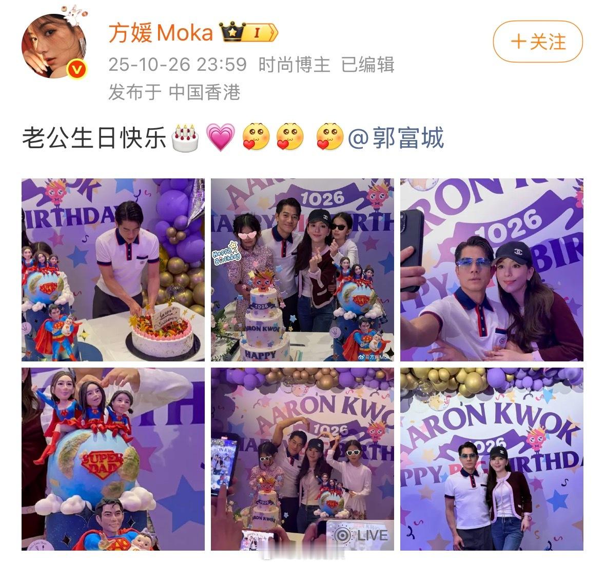 【方媛郭富城生日派对合照】方媛生三胎后为郭富城庆生 10月26日,生完三胎后首度现身为老公庆生。照片中,方媛状态大好,和郭富城甜蜜比心。