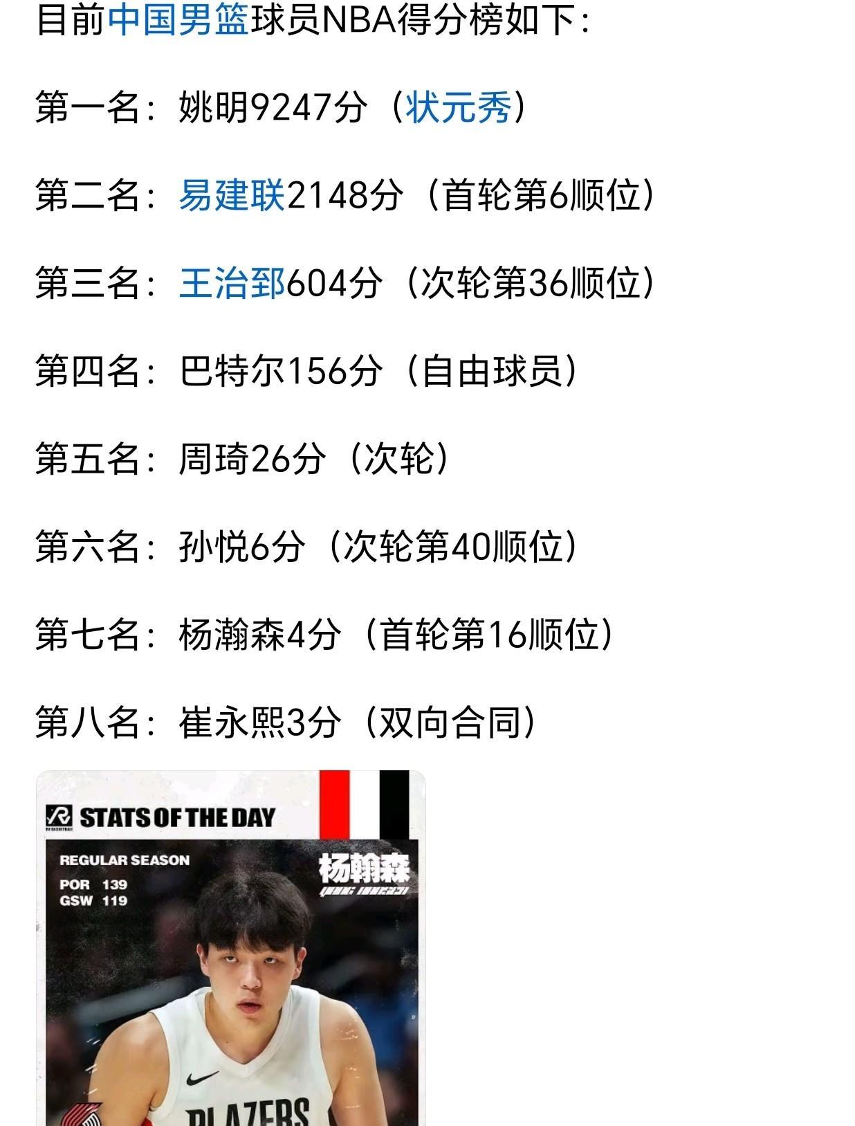 仅仅打了两场常规赛,很多球迷就开始把杨瀚森和姚明相比,显然还是为时过早了!可以这么说,无论从身体条件还是选位比较,杨瀚森和姚明都不是一个级别的,还有职业态度也是不如,至少人家姚明没有把女朋友带到美国。当然,杨瀚森虽然比不上姚明,但他的4分却已经超越崔永熙,后面超越孙悦的6分也是时间问题而已,不过能不能超越拿到26分的周琦就不好说了,这还得看杨瀚森能在开拓者待多久。
